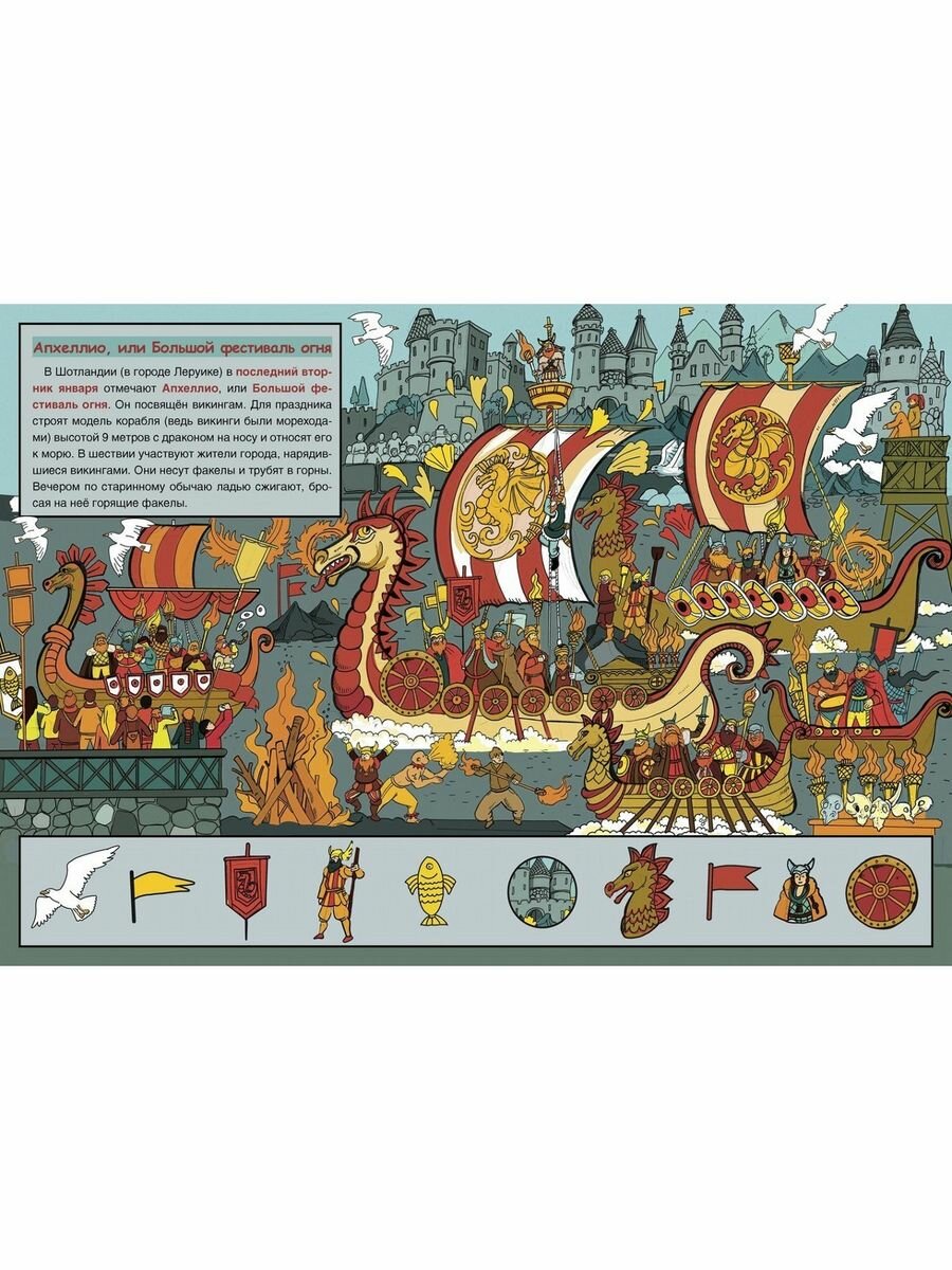 Виммельбух познакомит детей с праздниками разных стран, поможет в игровой форме узнать о традициях других народов. Листая до мельчайших деталей прорисованные иллюстрации, дети побывают на Венецианском карнавале в Италии, на Параде цветов в Голландии, примут участие в австралийской Королевской регате, Дне сурка в США, Празднике кукол в Японии, Фестивале воздушных змеев в Китае, битве томатами в Испании, Олимпиаде джентльменов в Англии и многих других событиях. На каждом развороте, помимо текста и иллюстраций, есть задание на внимательность.