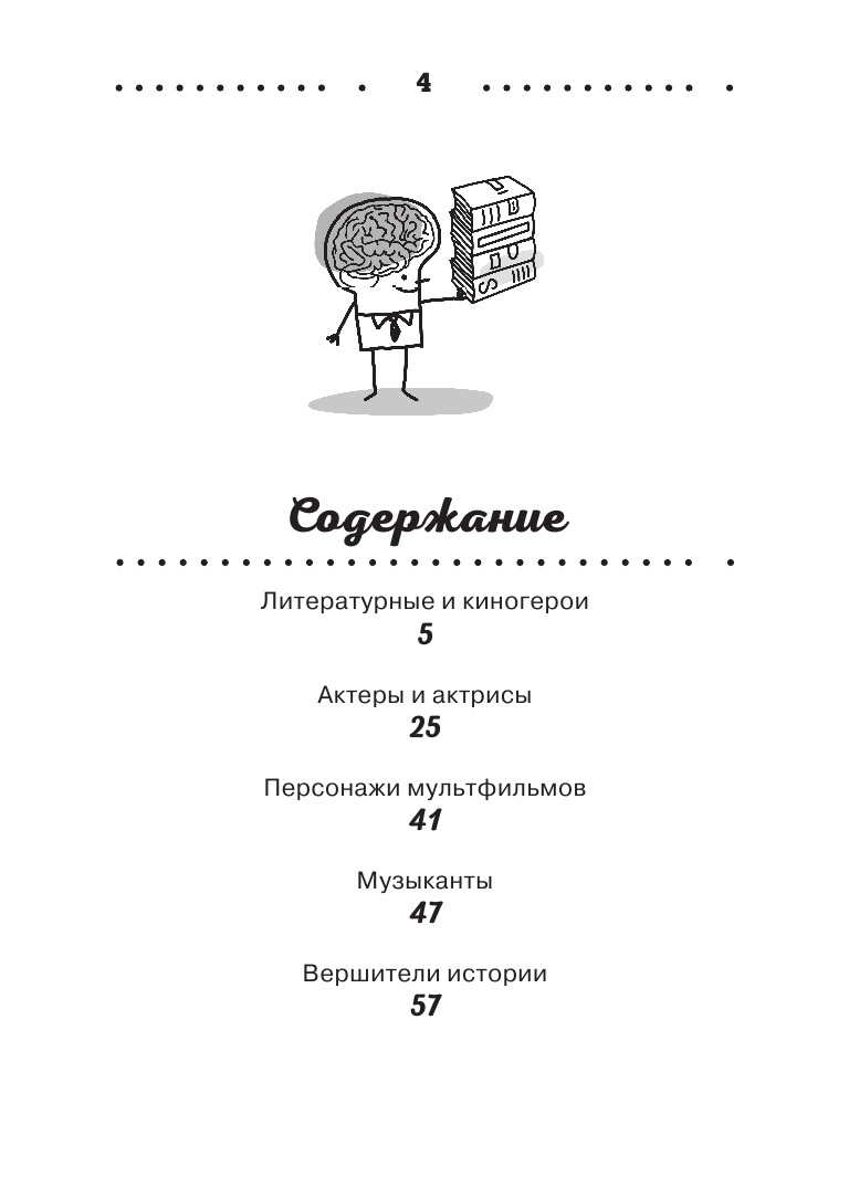мы часто играем в эту игру, и уже устали придумывать новых персонажей. эта книжка - настоящее спасение)) здесь есть несколько разделов: литературные и киногерои, актеры, персонажи мультфильмов, музыканты, вершители истории. благодаря этому можно играть и взрослым, и детям, например, мультяшек поотгадывать. понравилось, что есть современные личности,Нагиев, Ники Минаж, Эми Уайнхаус, например)