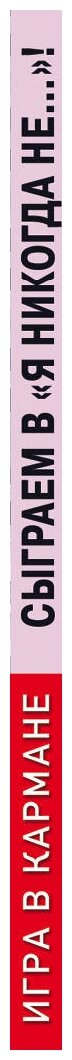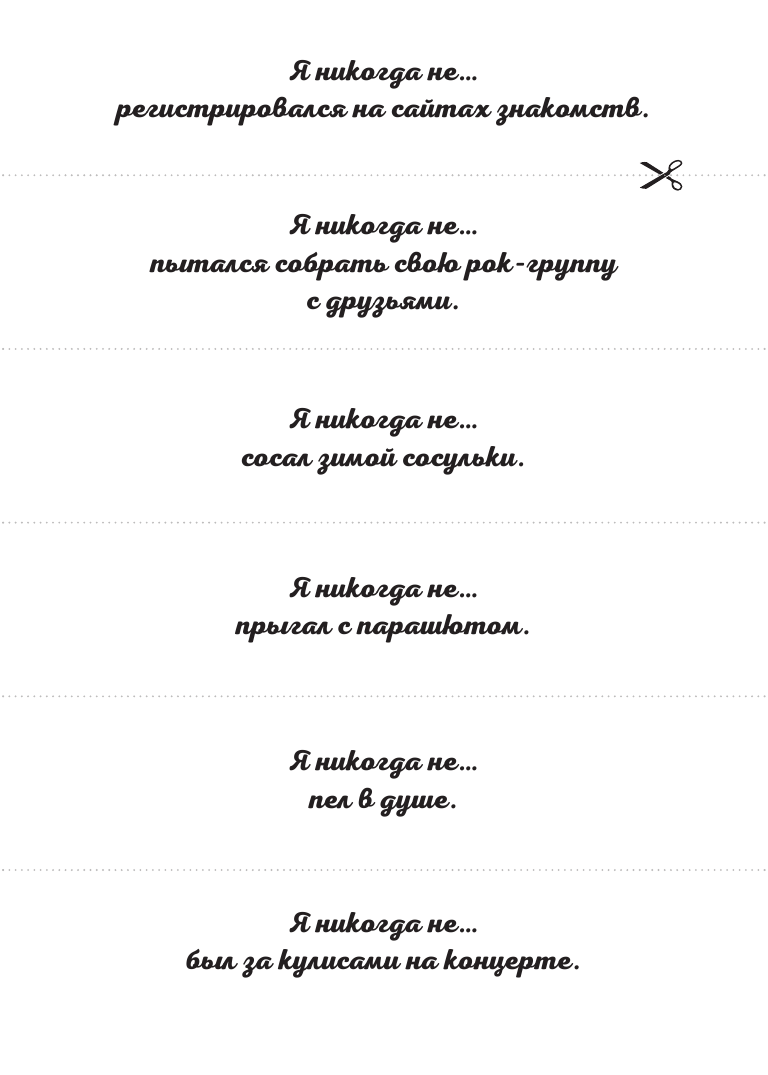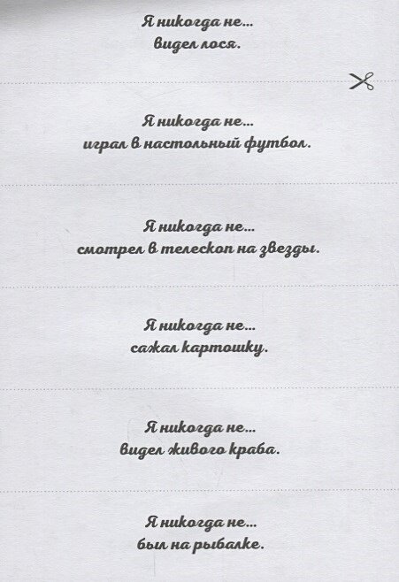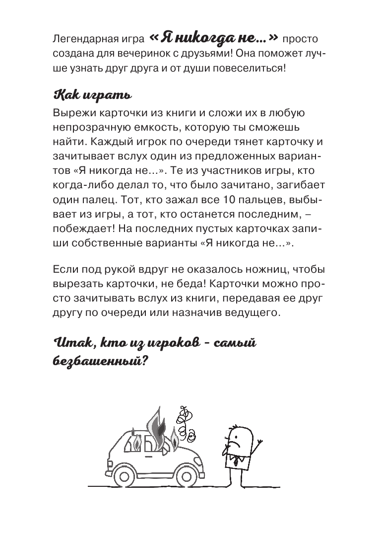 Книжечка хорошо пошла на каникулах. Это такая переносная игра, с очень простыми правилами - зачитываем одно дело на выбор и смотрим, как много людей никогда этого не делали. Важно охватить как можно больше людей, потому что это игра на выбывание. Затем и дается выбор, например, Я никогда: не был на острове / не катался на коньках / не делал селфи в туалете... Кто все-таки делал загибают палец. Кто загнул все десять - выбывает. По-моему хороший пример для того, чтобы люди в компании получше узнали друг друга или обнаружили что-то новое и необычное в старых знакомых.
