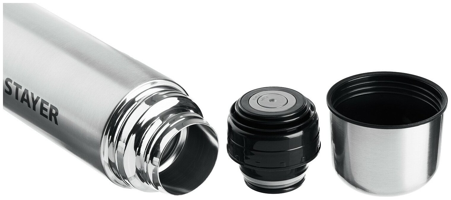 Туристический термос Stayer 48100-1000 — первоклассный термос для любителей активного отдыха на природе и путешественников. Двойные стенки из нержавеющей стали и надежная пробка-клапан позволяют сохранить температуру жидкости в течение длительного времени, а стальная колба устойчива к механическим повреждениям. Пробка-клапан с резьбовым соединением обеспечивает удобство в применении (не нужно открывать пробку, достаточно нажатия на клапан).