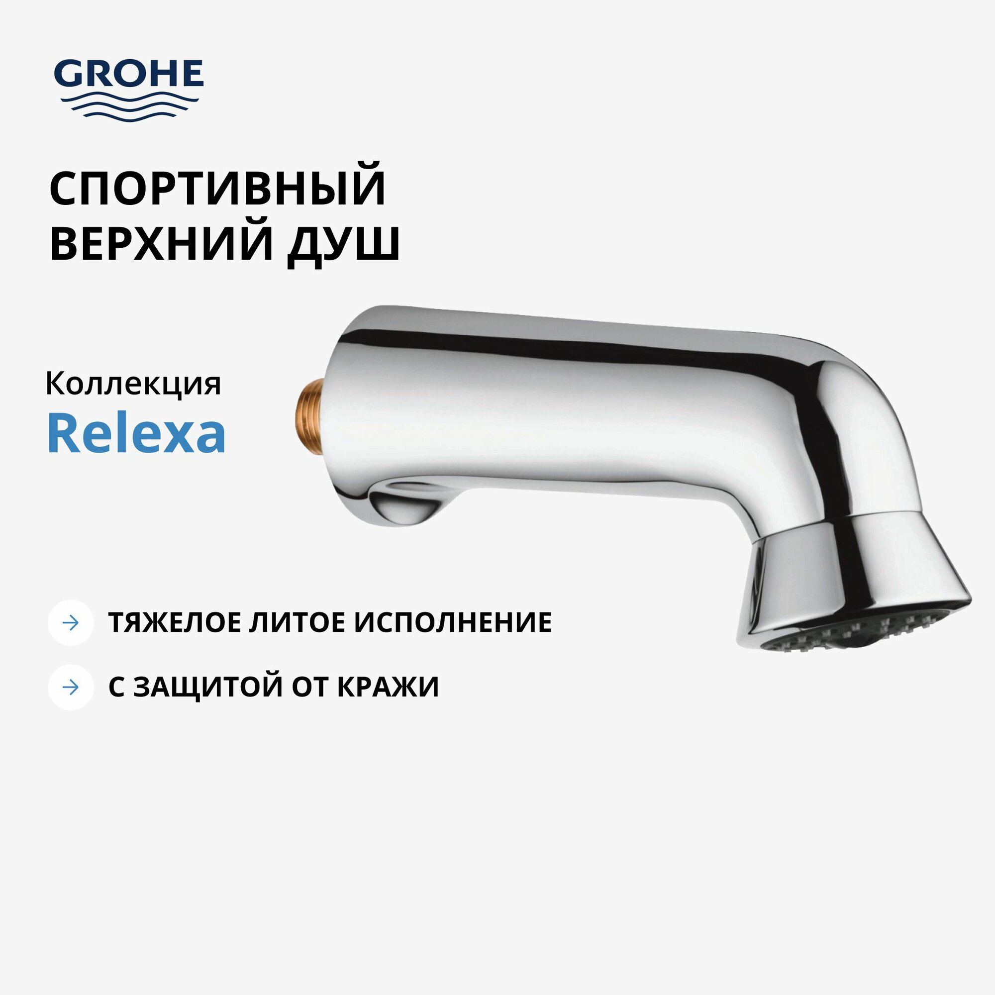 Верхний душ Grohe Relexa Plus ( Релакса Плюс ) 28948000 спортивный GROHE пожалуй самая известная марка на европейском рынке. Смесители GROHE это настоящие произведения от кутюр , вышедшие из виртуозных рук лучших инженеров и дизайнеров. Система контроля качества GROHE уникальна. Благодаря ей смесители GROHE обладают одинаковым высочайшим качеством - на каком бы заводе и в какой стране они ни были бы произведены.