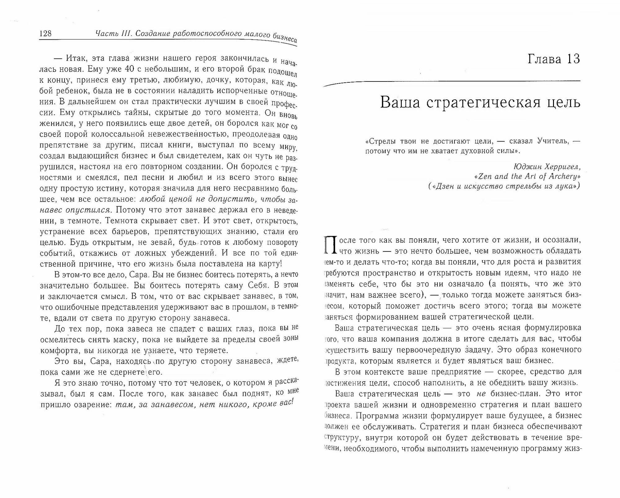 Книга написана в формате рассказа, что делает ее легкой для прочтения, да и не только легкой но и очень увлекательной! В книге автор рассказывает о предпринимательнице у которой дела идут не очень и он ей подсказывает, что стоило бы ей изменить в ее деле чтобы все наладилось, из главы в главу дела у нее улучшались, кроме того приводится много хороших примеров от других успешных предпринимателей! Я бы рекомендовал данную книгу тем кто уже занят в сфере малого бизнеса и особенно тем кто подумывает об открытии своего дела, данная книга откроет новичкам много подводных камней с которыми они могут столкнуться и дает конкретные способы избежать эти подводные камни. Мне книга очень понравилась, читал я ее давно, но вот сейчас перед тем как решил открыть свое дело решил перечитать и прочитал ее с легкостью и большим удовольствием во второй раз. Хоть книга и написана зарубежным автором, но принципы изложенные в книге вполне применимы в России, я бы наверное сказал применимы во всех государствах в которых предпринимательство является законным занятием.