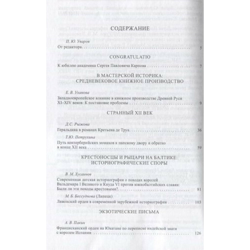 Выпуск открывается блоком статей, посвященных культурным и дипломатическим контактам России и Запада. Особое место занимает история XII столетия - времени появления геральдики, рыцарских романов, оформления системы папского правосудия. В данном выпуске много места уделяется проблемам Крестовых походов на Балтике и организации власти в орденских землях. Традиционными являются разделы: публикация источников (письма индейских касиков испанскому королю), раздел, посвященный истории медиевистики, научные дискуссии, рецензии и аннотации.