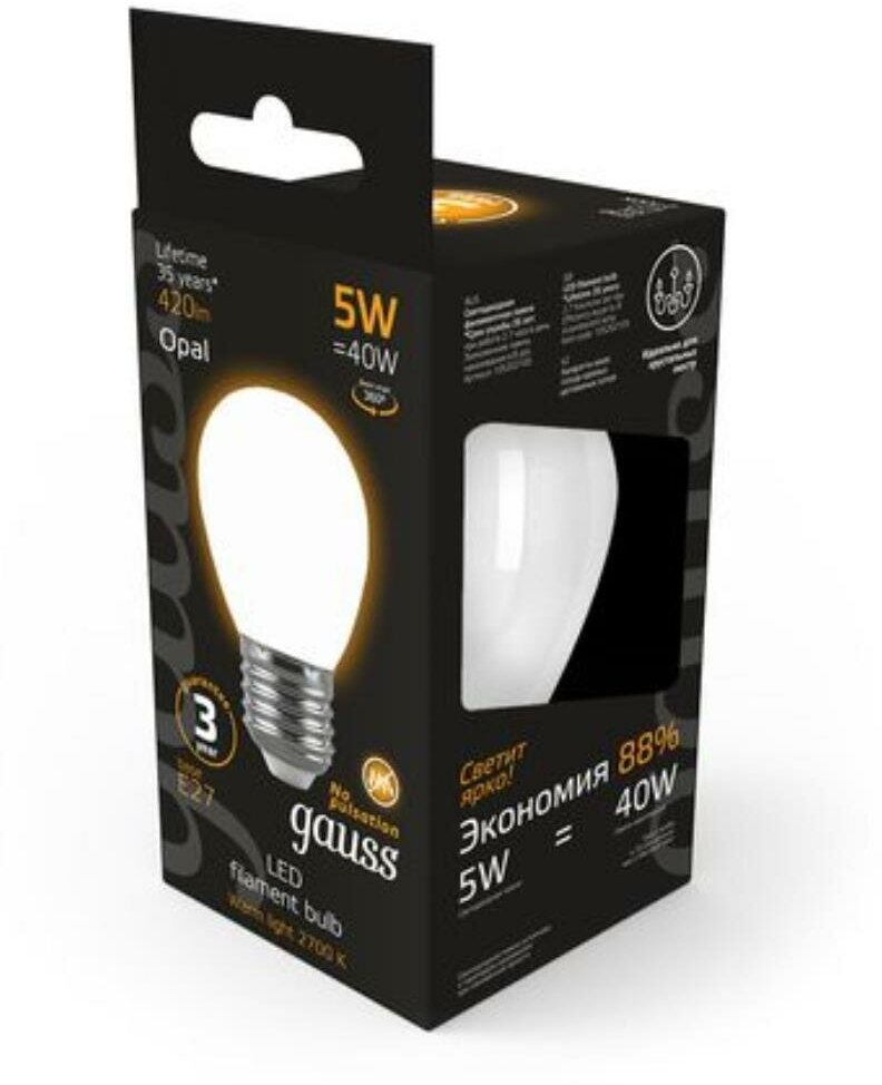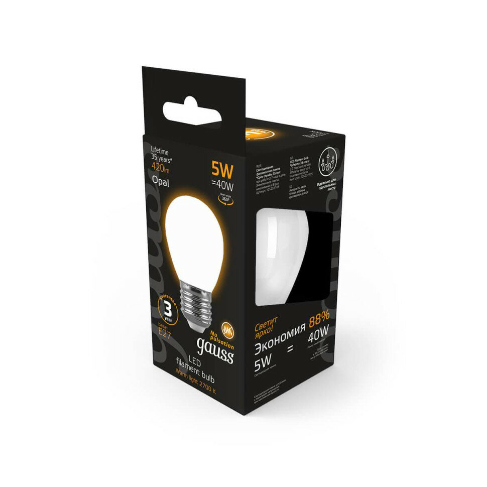 Светодиодная лампа Gauss LED Filament Globe Opal E27 5W 2700K - это высококачественный и экологически безопасный источник света. Лампы данного типа не требуют больших затрат электрической энергии, благодаря грамотному отводу тепла их корпус значительно меньше нагревается, что способствует продолжительности их службы. Покрытие колбы препятствует эффекту ослепления, а также не создает резкие тени.