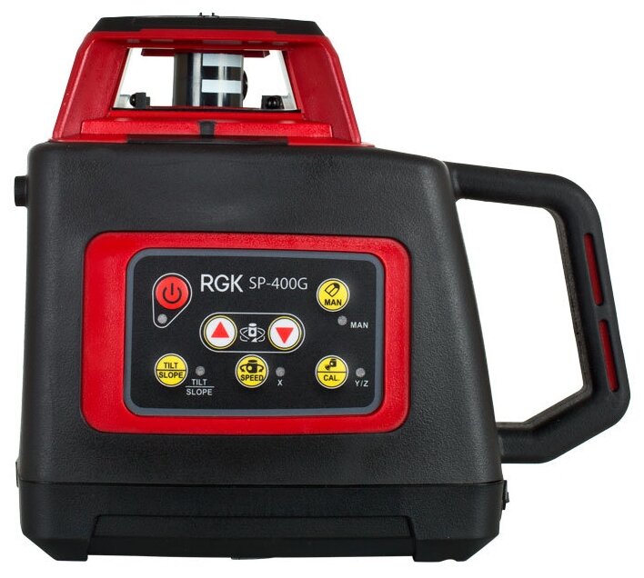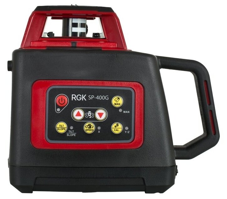 Ротационный нивелир RGK предназначен для работы с приёмником на расстоянии до 200 метров. Точность горизонтальной плоскости ±1 мм на 10 м, а вертикальной — ±1,5 мм на 10 м. Выравнивание выполняется с помощью сервоприводов в диапазоне ±5°. При выходе за пределы автовыравнивания лазер остановит вращение и отключится.
