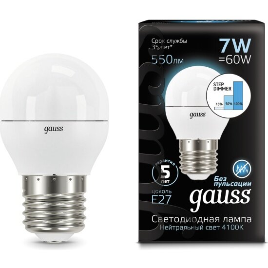 Gauss Лампа светодиодная Е27 180-240В 7Вт 4100К шаговое диммирование Светодиодная лампа - это современная альтернатива традиционной лампы накаливания. От обычной энергосберегающей лампы лампу этого типа отличает отсутствие ртути, что повышает ее экологическую безопасность и облегчает процедуру утилизации. Выгорание обивки мебели, краски и прочего не происходит за счет того, что светодиодная лампа не дает УФ-излучения, а высокая устойчивость к ударам позволяет использовать ее даже для уличного освещения.