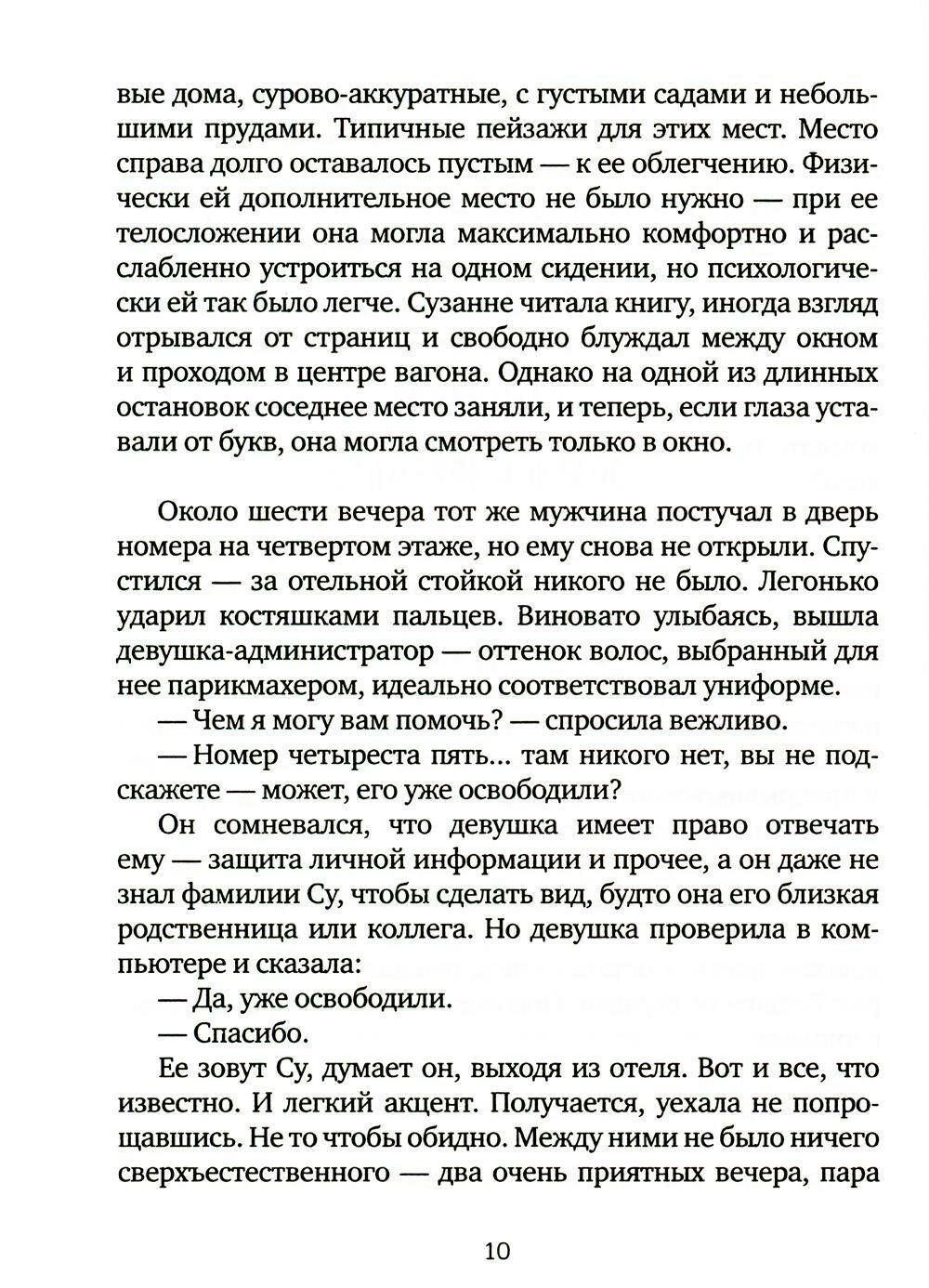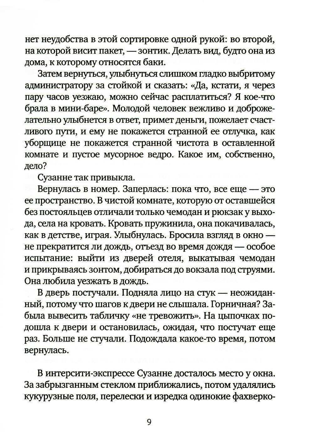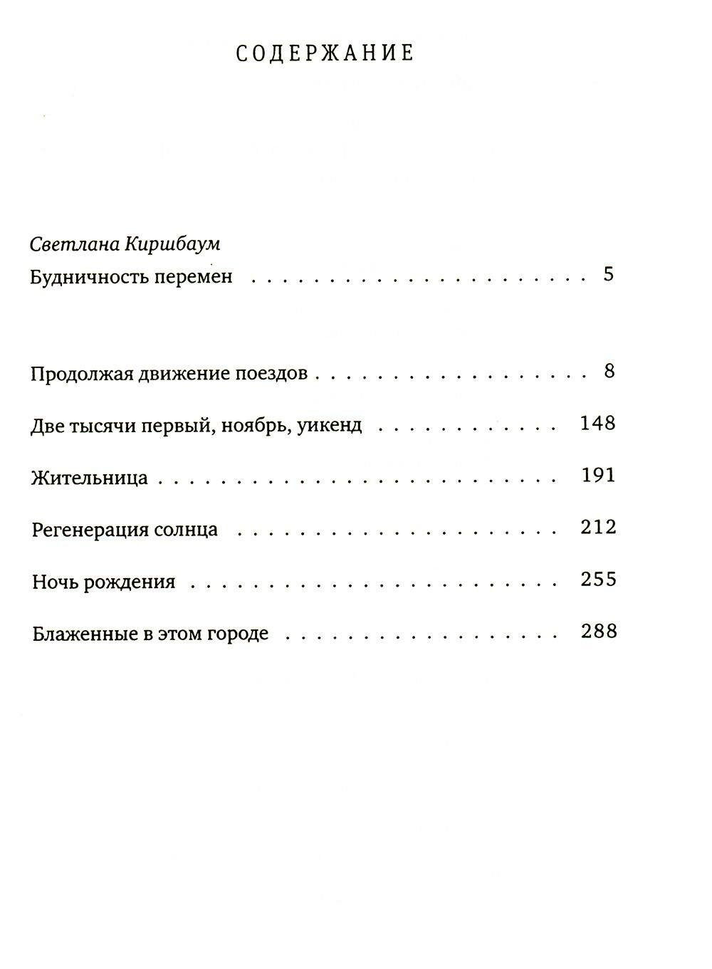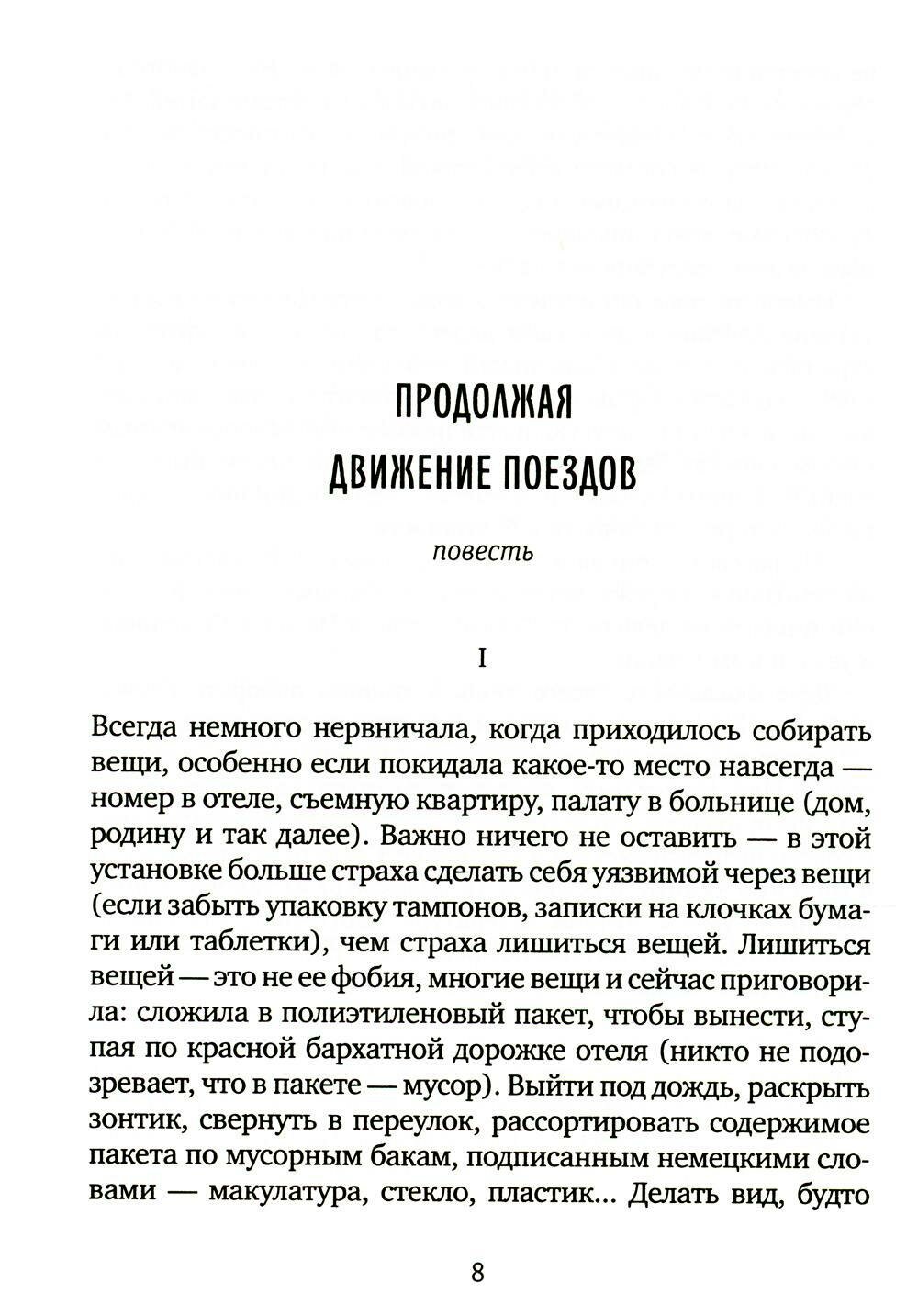 Сузанна переезжает из отеля в отель, хотя не знает, с кем играет в прятки. Патрик сходит на чужой станции и теряет высокооплачиваемую работу. Катя навещает подругу, чтобы заглянуть за шторку смерти. Нина делает вид, будто она - другая Нина. Марко перемещается в сны. Мария учится просыпаться. Влюбленные живут долго и счастливо. Бог кивает с неба. Место действия: города в разных странах и пространствах, соединенные железнодорожными путями. "Продолжая движение поездов" - книга о вечном поиске: себя, дома и чуда.
