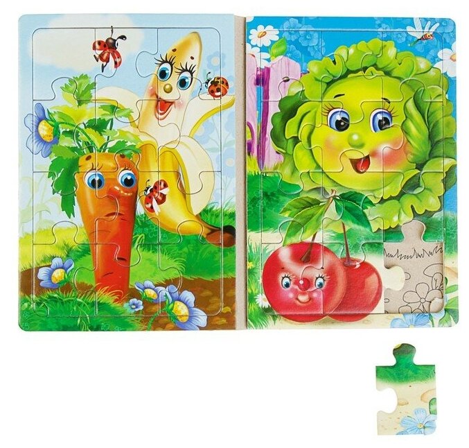 Книжка-пазл из 6 картинок "Овощи и фрукты"— это книга и игрушка для развития ребенка. За такой книжкой ваш ребёнок проведёт время с пользой и удовольствием. Страница за страницей, и новая картинка разбирается на фрагменты увлекая непоседу, а веселые и красочные персонажи подарят ему хорошее настроение! Паззлы отлично развивают моторику рук, память и мышление.