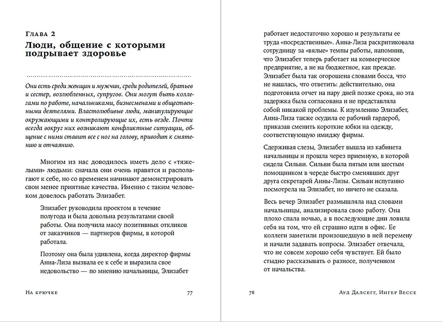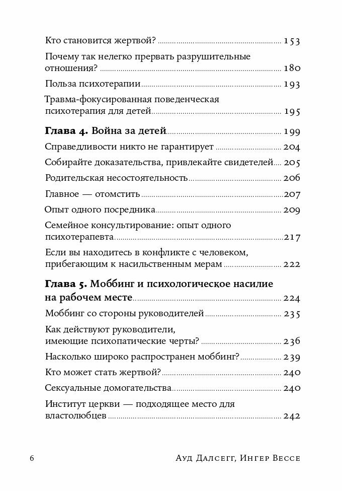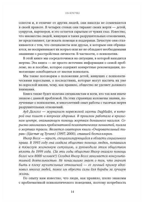 Что делать, если вас третируют в семье или на работе? Означает ли это, что вы действительно так жалки и никчемны, как некто убеждает вас? А может, вы просто имеете дело с психопатической личностью? Из книги, написанной двумя норвежскими авторами - журналисткой Ауд Далсегг и юристом Ингер Вессе, специализирующимися на темах домашнего насилия и моббинга, вы узнаете о том, кто такие психопаты, почему они так ведут себя с другими людьми и с какой стати им многое сходит с рук. В книге описаны разные типы психопатических личностей, а также манеры их поведения. Авторы приводят примеры наиболее типичных случаев попадания жертв к психопатам «на крючок» и предлагают действенные способы спасения даже из патовых ситуаций.