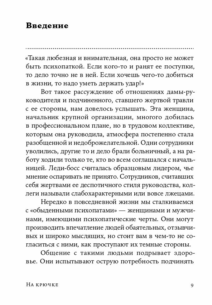 Книга заставила глубоко задуматься о том, как ведут себя люди в моем окружении. К сожалению, иногда авторы практически дословно описывали ситуации, с которыми я сталкивалась в жизни. Я не подозревала, что могут быть такие книги. Если честно, чтение "На крючке" похоже на беседу с психологом. Но осознание проблемы еще не может само по себе привести к ее решению. Поэтому важную часть от книги, которую можно назвать "полезной", на мой взгляд, должны составлять и подсказки, как себя вести. Именно это мне пока оценить в отношении книги сложно, но одно то, что практически половина от содержания посвящена именно стратегиям разговора и поведения, уже воодушевляет. Поэтому с надеждой ставлю авансом 5 звездочек!