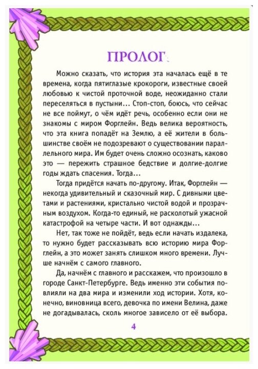 Необычная история, которая случилась с девочкой Велиной из города Санкт-Петербурга, захватывает буквально с первых строк. Пропадает её отец - ученый и изобретатель, изучающий проблемы экологии. Девочка отправляется на поиски папы и попадает в другой мир. На её пути встречается много опасностей, но Велина справляется со всеми трудностями. Она не только находит отца и помогает ему спасти Землю от ужасной катастрофы, но и встречается со своей мамой. Замечательно то, что эта история еще и поучительная - на протяжении всего повествования просматривается тема экологии - бережного отношения к своей планете.