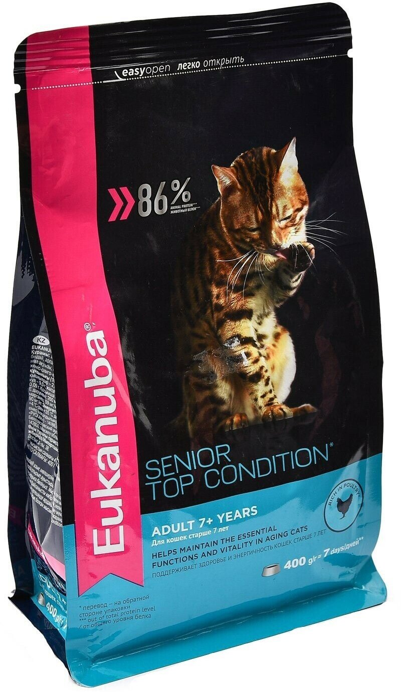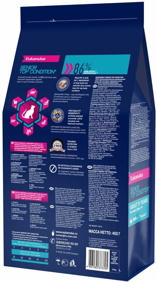 Сухой корм Eukanuba имеет специальный состав, рассчитанный на пожилых кошек старше 7 лет. Поддерживает здоровье и активность животных, укрепляет кости, зубы и волосяной покров. Способствует комфортному пищеварению, является профилактикой мочекаменной болезни и усиливает защитные системы организма. Корм содержит 44% мяса домашней птицы, злаки, рыбий жир и пивные дрожжи. Расфасован в пластиковые пакеты по 2 кг. Особенности: Баланс жирных кислот обеспечивает блеск и шелковистость шерсти, предотвращает ее усиленное выпадение. Антиоксиданты укрепляют иммунитет, защищают от действия вредных веществ и улучшают обменные процессы. При хорошо налаженном питьевом режиме корм снижает риск заболеваний мочевыделительной системы. Твердые кусочки заставляют кошку очищать ротовую полость, что способствует длительному сохранению здоровья зубов. Большое содержание животного белка (до 86%) положительно сказывается на состоянии мышечной ткани.
