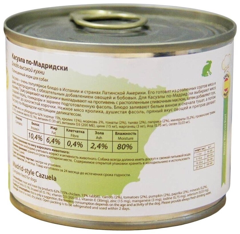 Косуэла — очень популярное блюдо в Испании и странах Латинской Америки. Его готовят из различных сортов мяса и даже морепродуктов, с обязательным добавлением овощей и бобовых. Для косуэлы по-мадридски выбирают мясо кролика. Тушку разрезают на кусочки и выкладывают на противень с растопленным сливочным маслом, затем добавляют лук, сладкий перец, помидоры и заранее подготовленную фасоль. Блюдо заливают белым вином и сначала тушат, а потом запекают до золотистой корочки. Нежное мясо кролика, душистая фасоль, пряный вкус овощей и приправ делают косуэлу по-мадридски настоящим деликатесом. Нормы кормления по весу взрослого животного: при кормлении небходимо учитывать возраст и активность животного. Собака всегда должна иметь доступ к свежей питьевой воде.