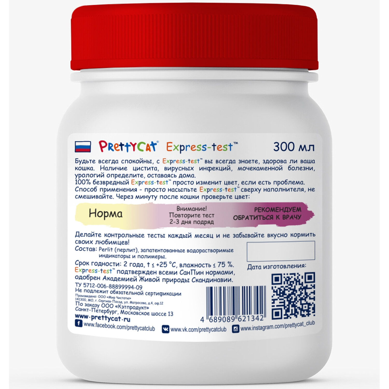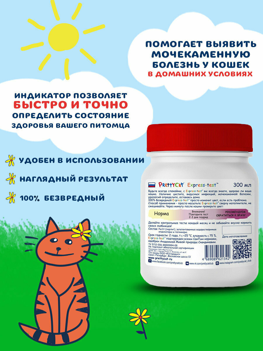 Своевременно диагностирует мочекаменную болезнь, цистит, вирусные инфекции, урологию. Применение: Просто насыпьте содержимое банки сверху наполнителя. После посещения кошкой лотка через 1-2 минуты проверьте цвет и сравните со шкалой, указанной на упаковке. Желтый - норма. Бледно-розовый - Внимание! Повторите тест 2-3 дня подряд. Ярко-розовый - срочно к врачу. С экспресс-тестом Pretty Cat вы всегда будете знать, здорова ли ваша кошка.