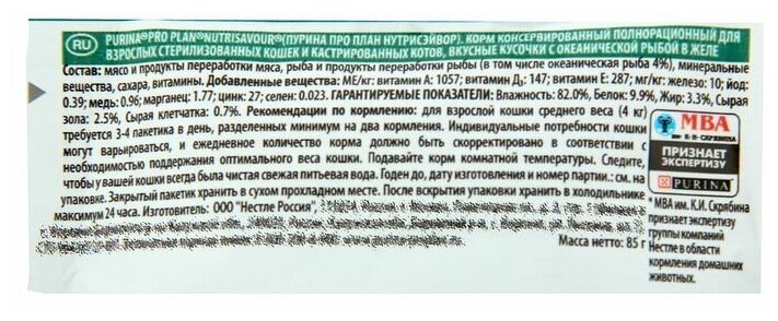 Котик очень любит эти рыбные кусочки в соусе. Всегда просит добавки. Правда само филе рыбы я не увидела. По составу корм не плохой, запах тоже у корма нормальный. Упаковка с линией надрыва по краям, для удобства. Из минусов хотелось бы, чтобы можно было ставить вертикально, уж очень не удобно.