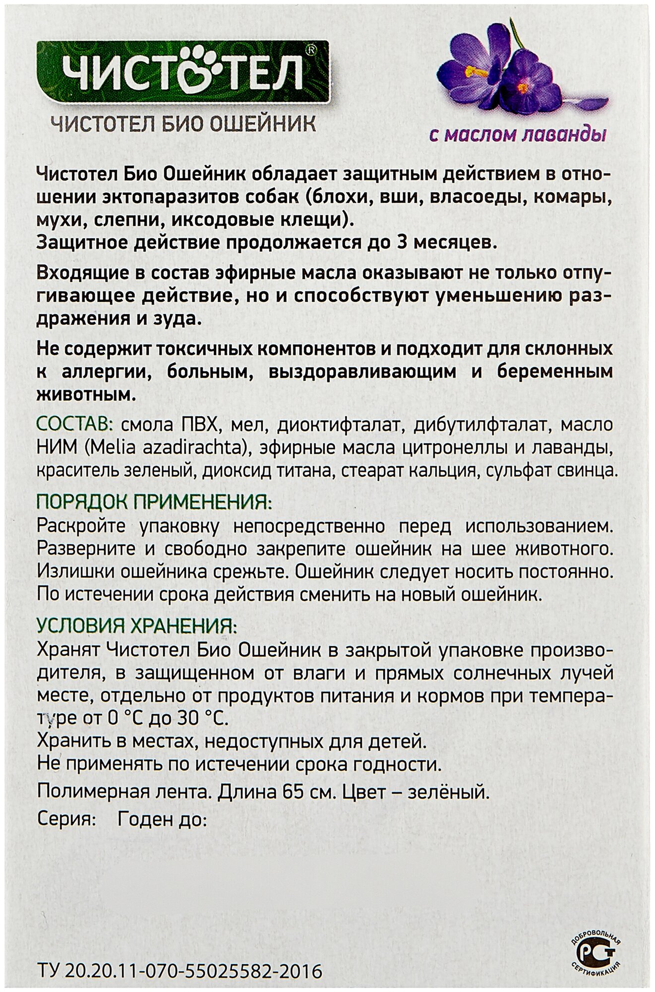 Модель: Ошейник Чистотел БИО с лавандой для средних и крупных собак 65 см