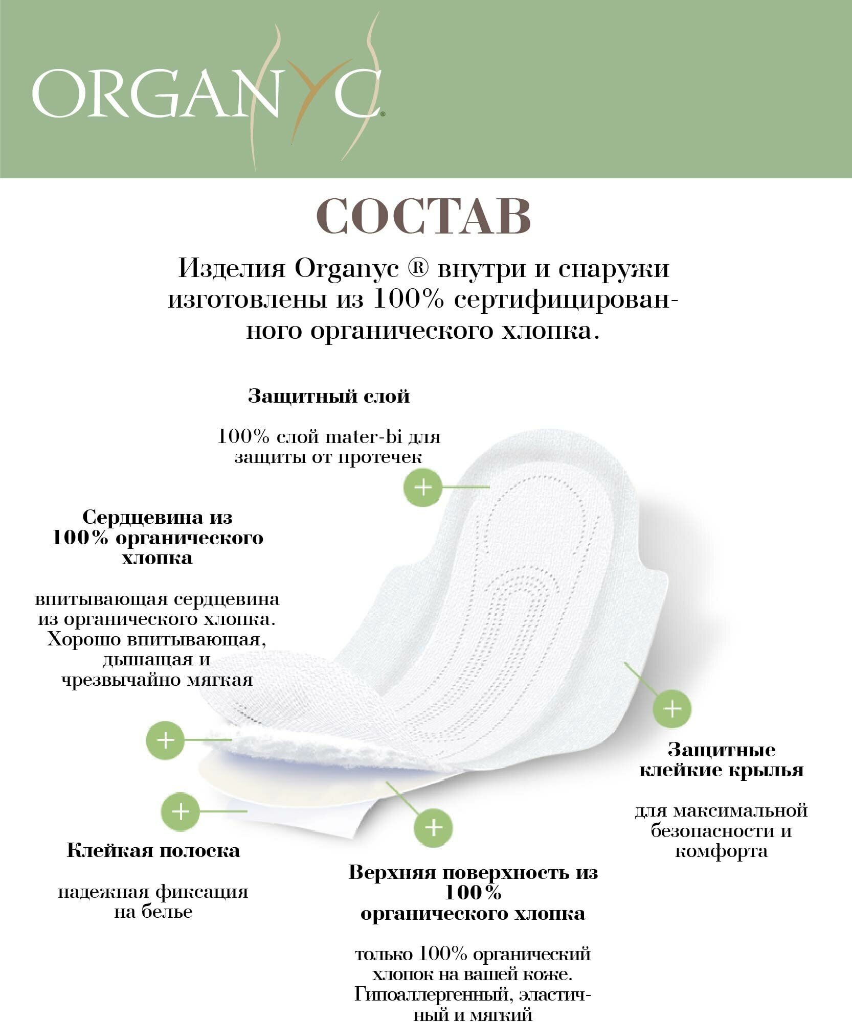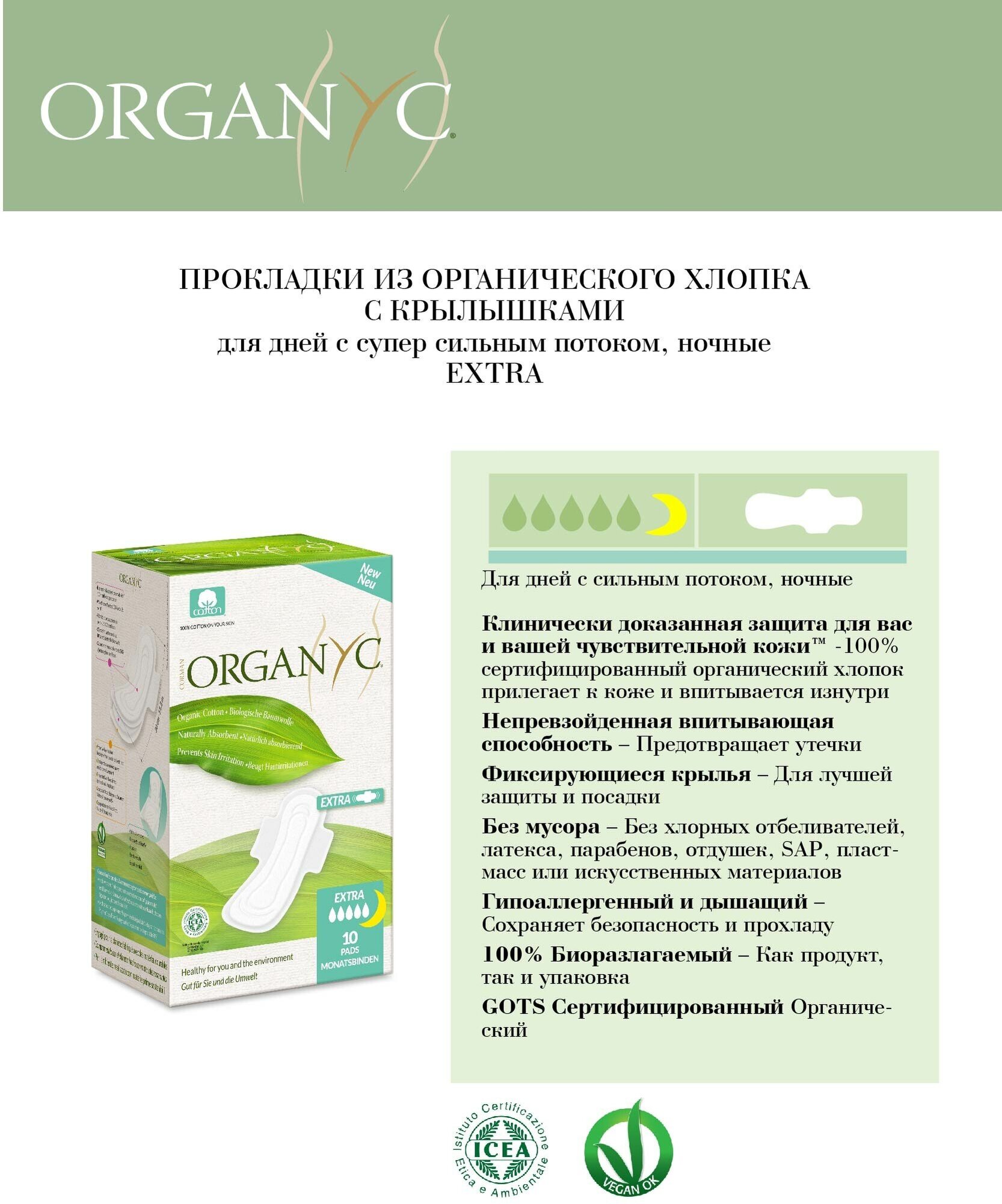 Прокладки с крылышками Ночные ультратонкие Organyc надежно защищают от протекания в ночное время, дарят ощущение безопасности и комфорта при обильных выделениях. Изготовлены из 100%-го натурального хлопка, который отлично впитывает и мгновенно принимает форму тела. Идеально подойдут женщинам, желающим избежать контакта с синтетическими материалами. Не содержат вредных химических добавок: отдушек, консервантов, красителей, хлорных отбеливателей и нефтехимических адсорбентов. Абсолютно безопасны для женского здоровья. Прокладки Organyc – сертифицированный органический продукт, который не вызывает раздражения, не нарушает естественной микрофлоры и поддерживают нормальный уровень pH.