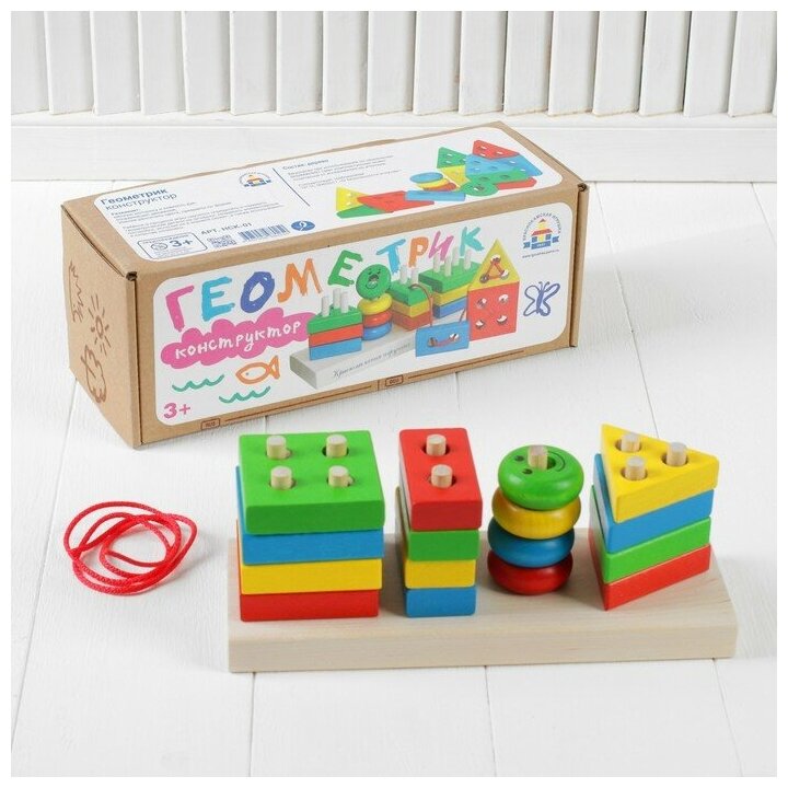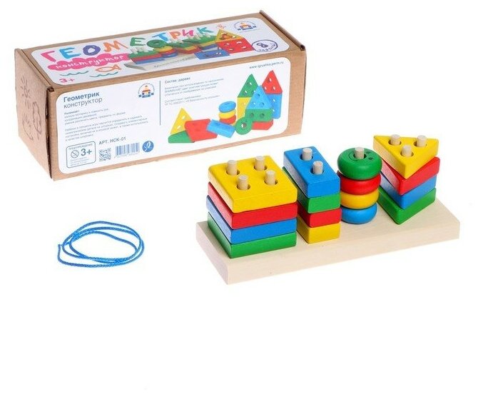 Набор Геометрик - это конструктор из дерева. В нем спрятано сразу три развивающих игры - сортер, мозаика и шнуровка. Играя с Геометриком ребенок познает цвета, геометрические фигуры, учится считать, собирать пирамидки и другие конструкции. Ребенка можно научить надевать фигурки, как на штырьки, так и на шнурок, это координирует движения и развивает моторику. Также взрослые могут рассказать малышу о цветах и показать как сортировать фигурки по цвету. То же самое можно проделать с формами - научить маленького исследователя отличать круг от квадрата и так далее. Благодаря разным размерам и формам можно вместе с малышом построить первые домики, паровозики и пирамидки. Детальки конструктора возможно использовать как трафарет и обводить фигурки карандашом на бумаге. Благодаря Геометрику малыш быстро научится считать, сравнивать, рассуждать, а упражнения с нанизыванием фигурок поможет подготовить руку к письму. Набор Геометрик - это целый комплекс развивающих занятий в одном конструкторе. Все детали конструктора изготовлены из экологичной натуральной древесины, которая обработана и окрашена безопасными для детей красками.