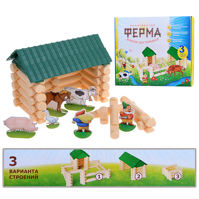 Конструктор Домики для гномиков от торговой марки Эра содержит детали для сборки фермы, где смогут поселиться гномики и животные. Детали выполнены в виде брусочков, изготовленных из качественного пластика. Они легко соединяются друг с другом, образуя прочную конструкцию. В наборе также можно найти фигурки маленьких гномиков и различных домашних животных.