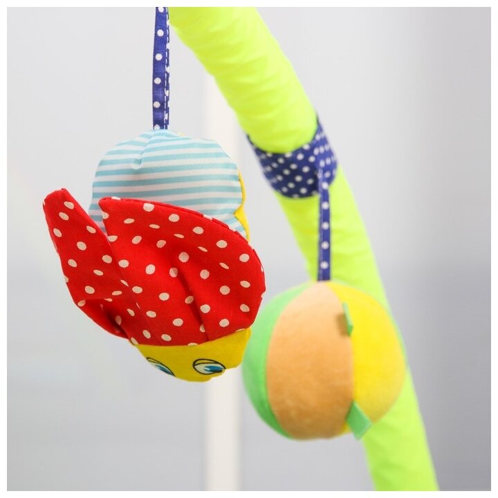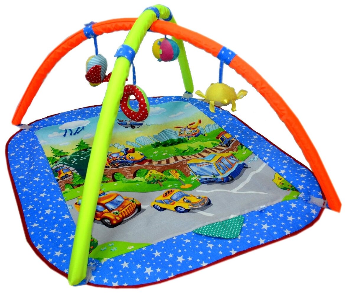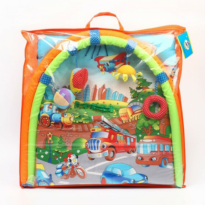 Развивающий Коврик с дугами Веселый парк понадобиться малышу практически с рождения. В коврике малыш будет и отдыхать, и играть. На дугах, пристегивающихся к коврику, подвешены яркие и забавные игрушки, которые малыш будет с удовольствием изучать. По мере необходимости на дуги можно прикрепить любые другие игрушки- подвески.