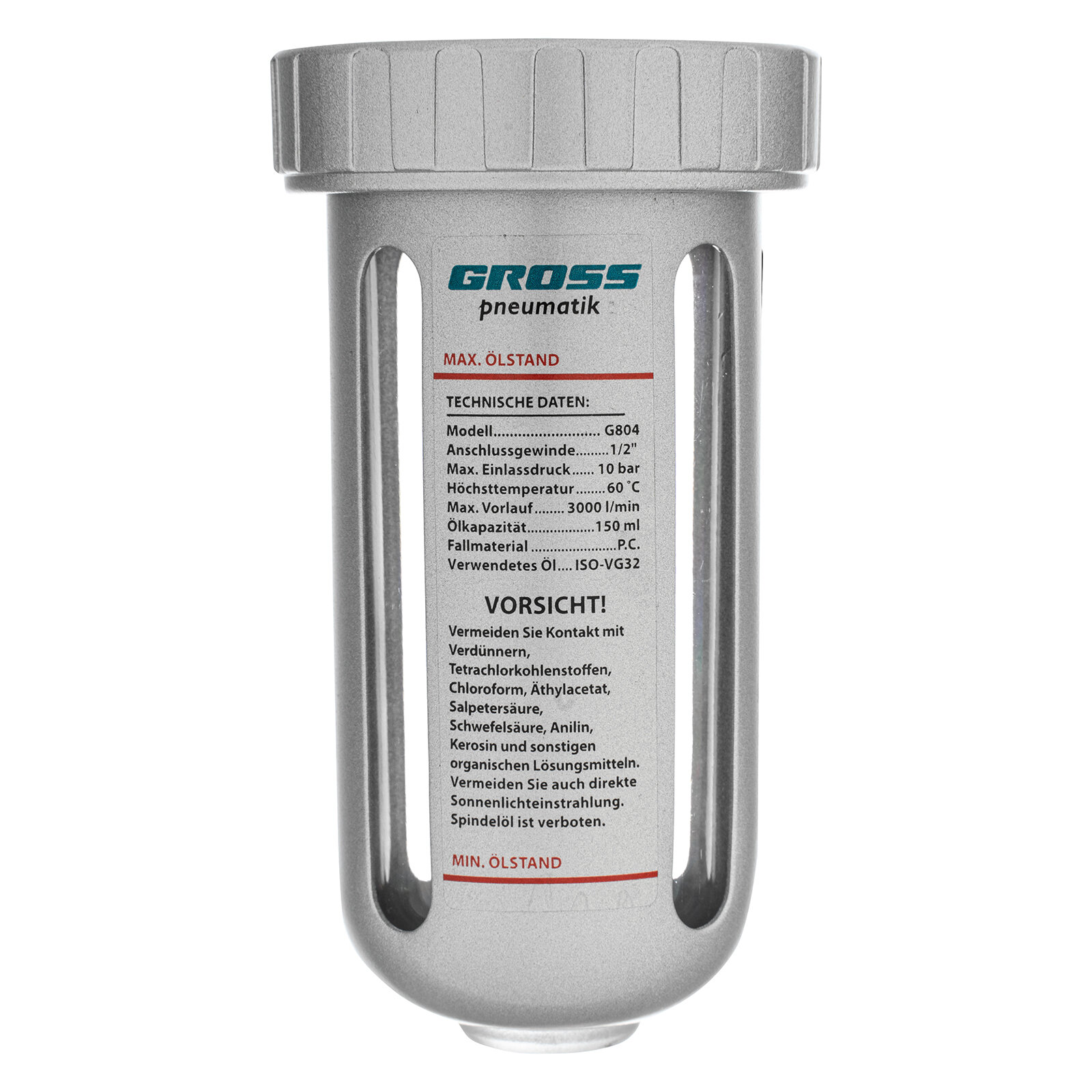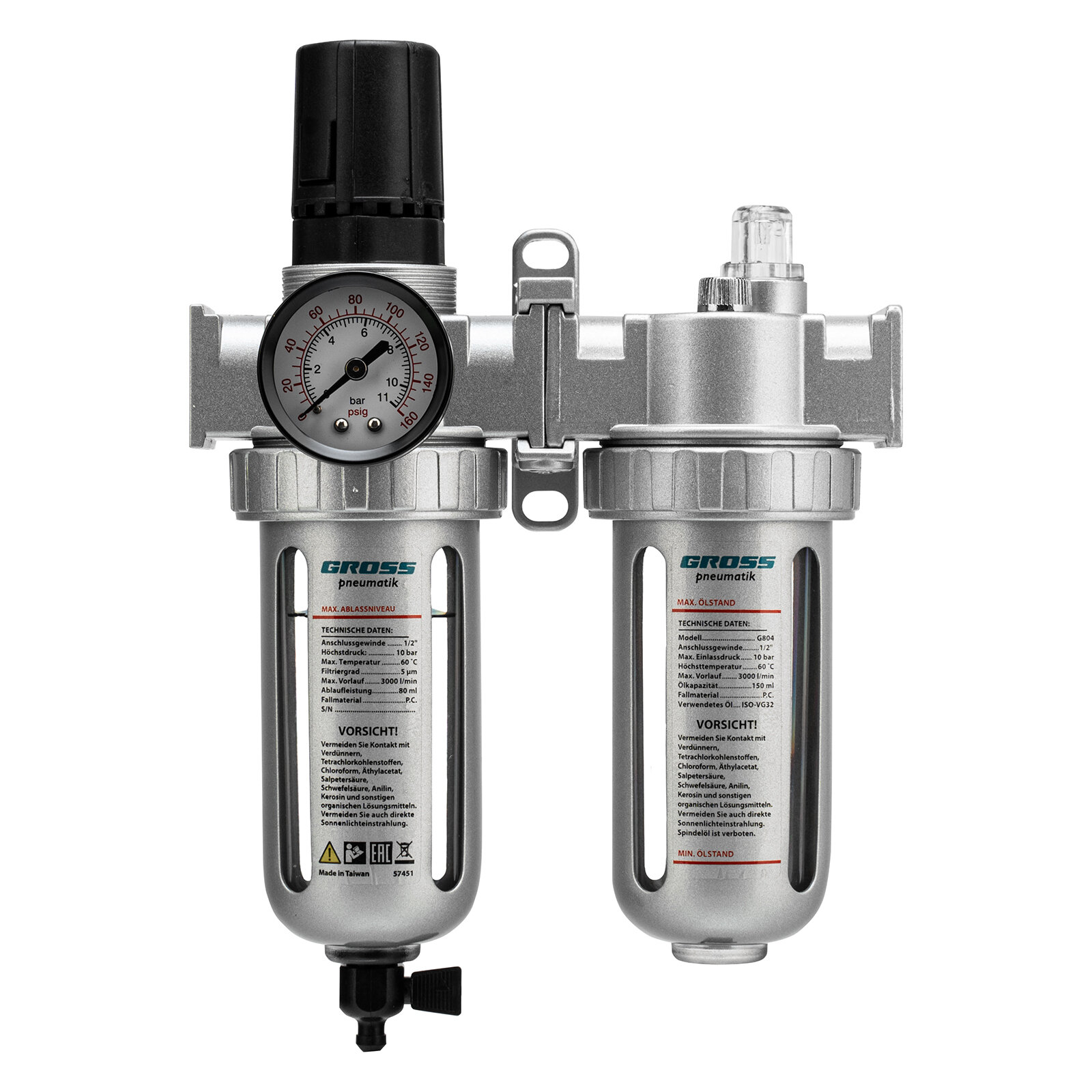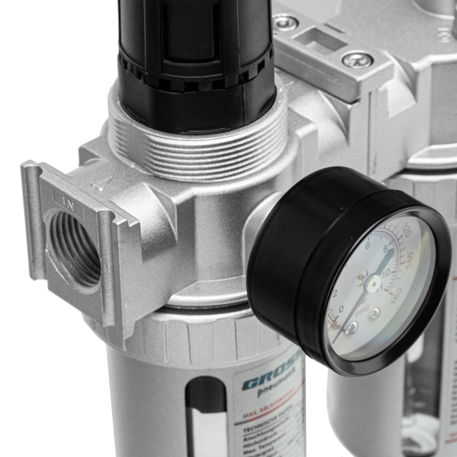 Блок подготовки воздуха Gross G804 с присоединительной резьбой 1/2 дюйма одновременно выполняет функции регулятора уровня давления, фильтра и лубрикатора. Устройство используется с компрессорами, работающими под давлением до 10 бар, и будет полезно на производстве, строительной площадке и в автомастерской.ПреимуществаКонтроль давления — регулятор помогает избежать аварийных ситуаций, а также позволяет подключать пневмоинструменты с различным рабочим давлением.Чистый воздух — фильтр не пропускает в пневмомагистраль капли конденсата и частицы размером от 5 мкм.Подача масла — лубрикатор обеспечивает смазку пневмоинструмента и предотвращает его преждевременный износ.Высокая производительность — пропускная способность блока составляет 3000 л/мин.Надежность — стальной корпус блока не разрушается под воздействием сжатого воздуха.Сливной клапан — предусмотрена возможность автоматического сброса скопившегося конденсата.Подтвержденное качество — гарантия на заводской брак действует 3 года.