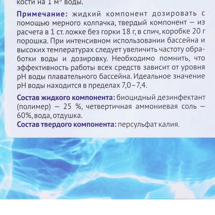 - текущая обработка-один раз в 5-7 дней 10 г порошка и 5 мл жидкости на 1 кубический метр воды