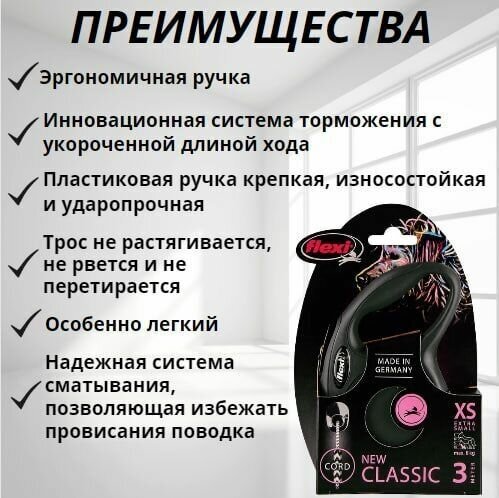 Рулетки FLEXI производятся в Германии более 40 лет и особое внимание уделяется обеспечению безопасности и комфорта использования: обновленная эргономичная кнопка системы торможения, запатентованная тормозная система, надежный карабин, светоотражающие элементы. Запатентованая система сматывания и фиксации длины — дополнительное удобство, помогающее контролировать поведение животного. Корпус рулетки выполнен из ударопрочного пластика. Рулетка очень легка в применении, принесет вам еще большую радость от моментов, проведенных с любимцем.