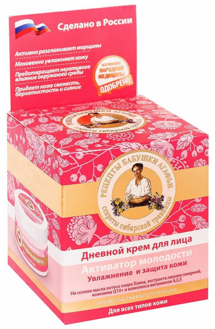 Данный дневной крем создан по рецептам сибирской травницы Агафьи и содержит хорошо сбалансированный комплекс активных веществ, наделяющих его способностью наполнять кожу живительной влагой, стимулировать процессы регенерации и замедлять ее старение. Лотос озера Ханка, который в большом количестве содержит витамины C, B и флавоноиды, у местных жителей считается символом чистоты, красоты и совершенства. Получаемое из него масло активизирует метаболические процессы в клетках, повышает тонус кожи и оказывает целебное омолаживающее действие. Присутствие в составе экстракта линнеи северной – растения, которое произрастает в суровых сибирских условиях и вобрало в себя силу и энергию северной природы, оказывает на кожу мощное увлажняющее воздействие, придает ей гладкость и роскошное сияние. За счет содержания коэнзима Q10 и комплекса витаминов A, E, F крем активно омолаживает кожу, придает ей эластичность, упругость и активно разглаживает морщины.