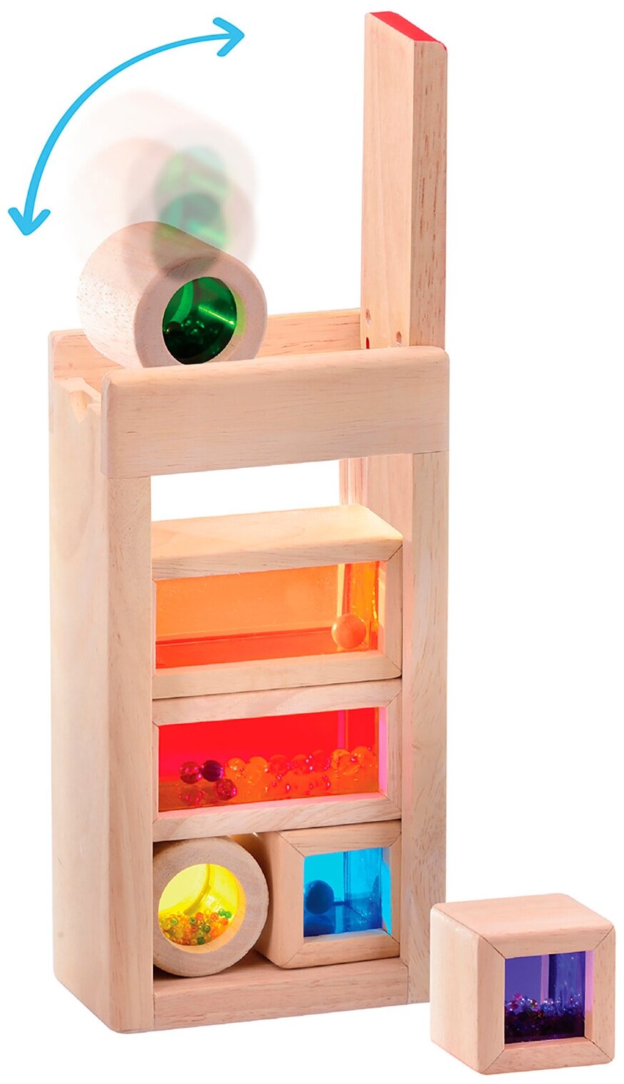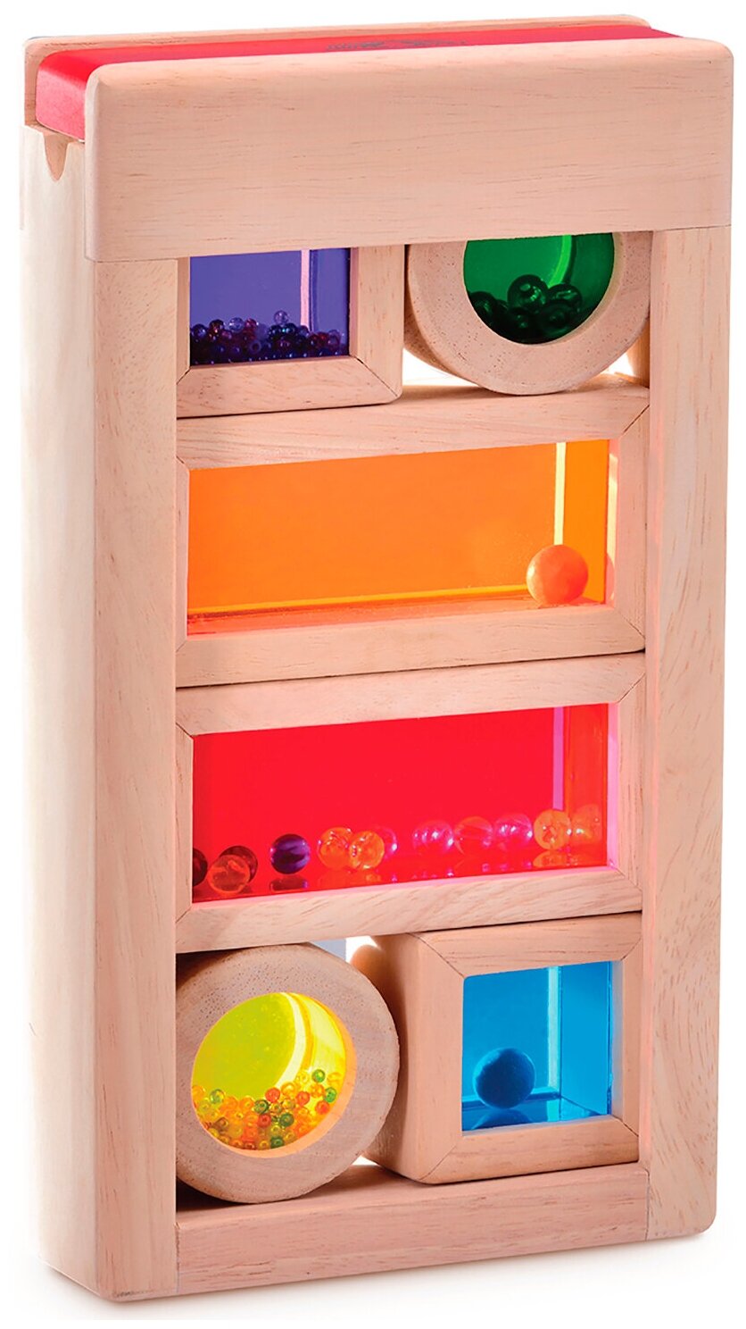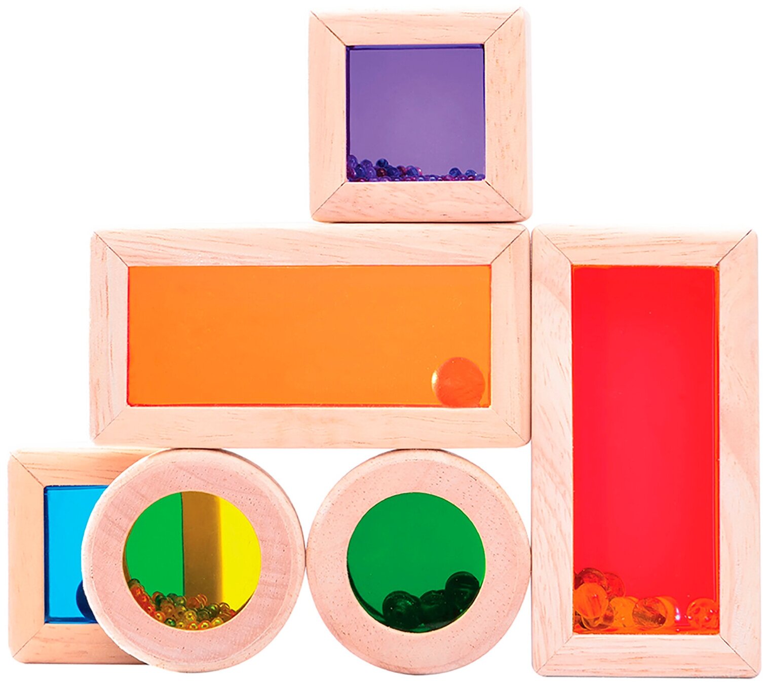 Радужные блоки различной формы с цветными прозрачными вставками и звуковыми эффектами. Прозрачные цветные вставки знакомят детей с цветом и дают представление о проникающей способности цвета. С помощью таких кубиков можно создавать цветные тени или, посмотрев сквозь них, окрашивать мир вокруг. А при комбинировании радужных блоков цвета накладываются и дают новые оттенки. Каждый блок звучит по-своему.
