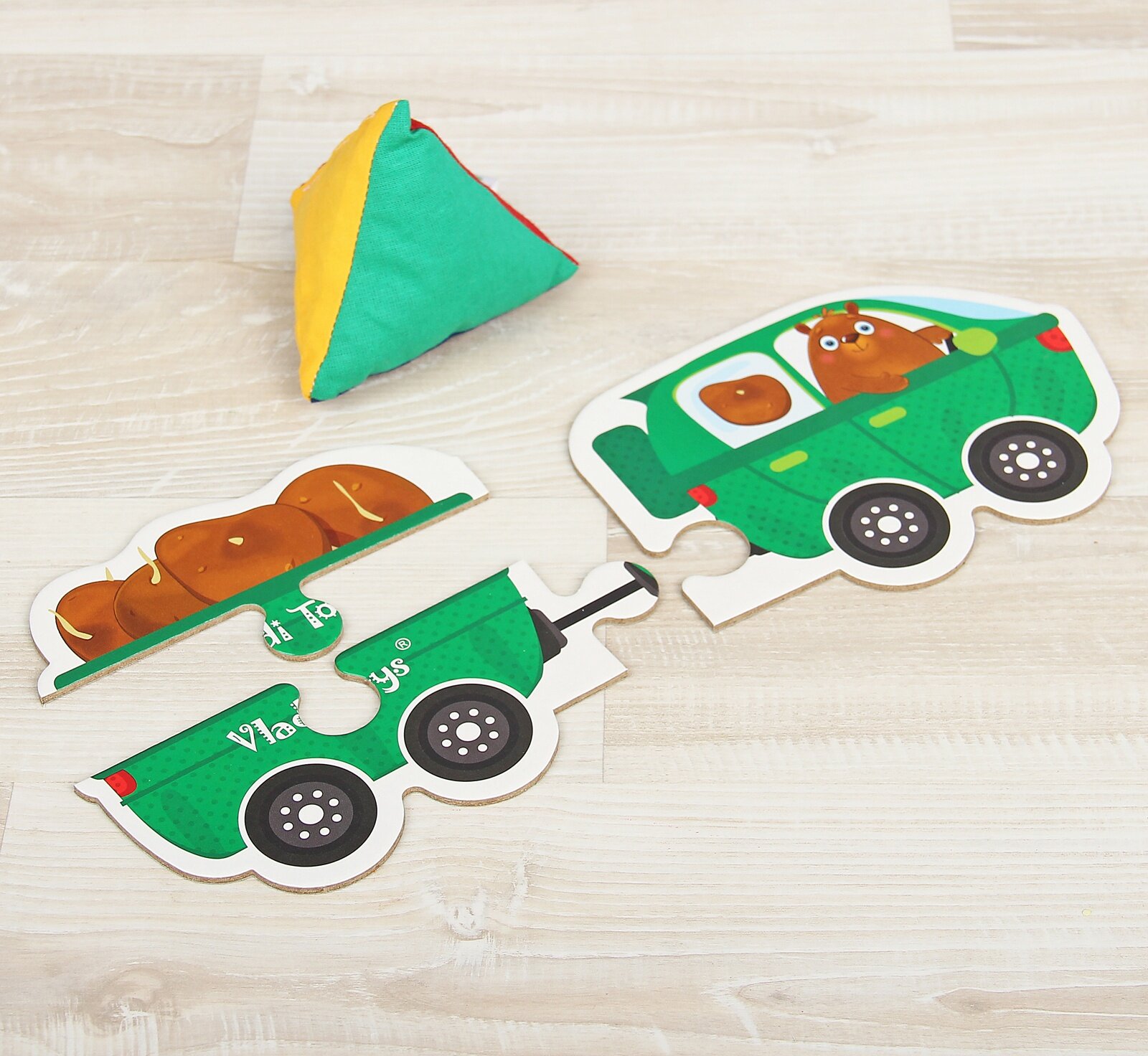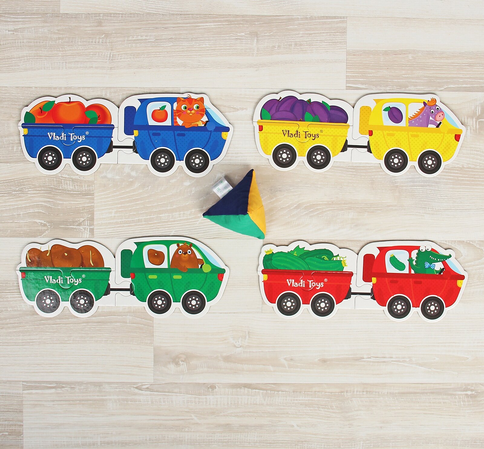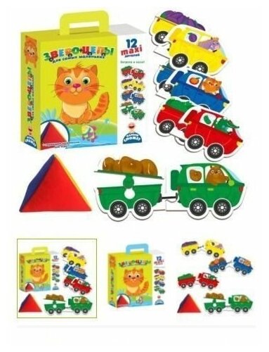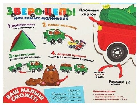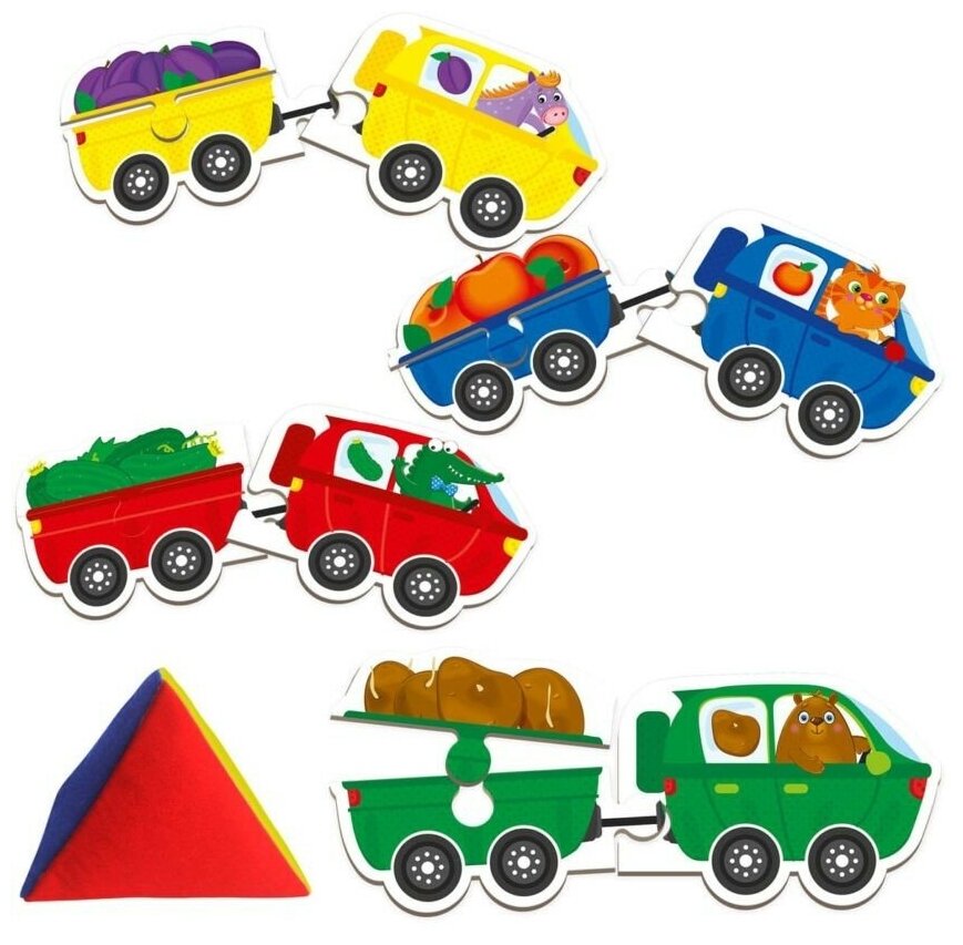 Веселые грузовички везут товары во все уголки света. Задача малыша собрать транспорт из деталей подходящего цвета и положить нужный груз. В набор входят крупные детали пазлов из прочного картона и мягкая пирамидка-погремушка. Выберите с ее помощью один из цветов, и начинайте собирать грузовик в дорогу. Водитель подскажет, какой груз нужно везти. Игра развивает логику, мышление и внимательность.
