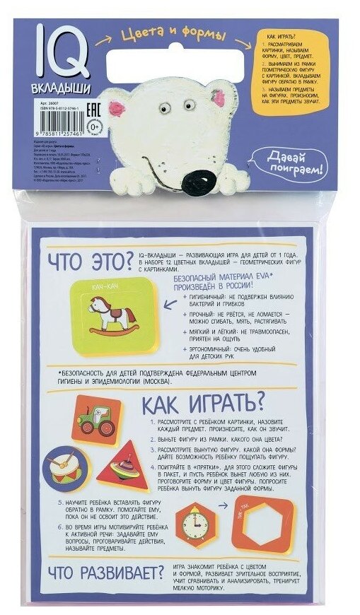 IQ-Вкладыши Цвета и формы - это увлекательная настольная игра, которая поможет познакомить ребёнка с геометрическими фигурами, развить его восприятие и мелкую моторику. Малыш научится координировать движения руки и пальцев, а это напрямую влияет на развитие интеллекта.
