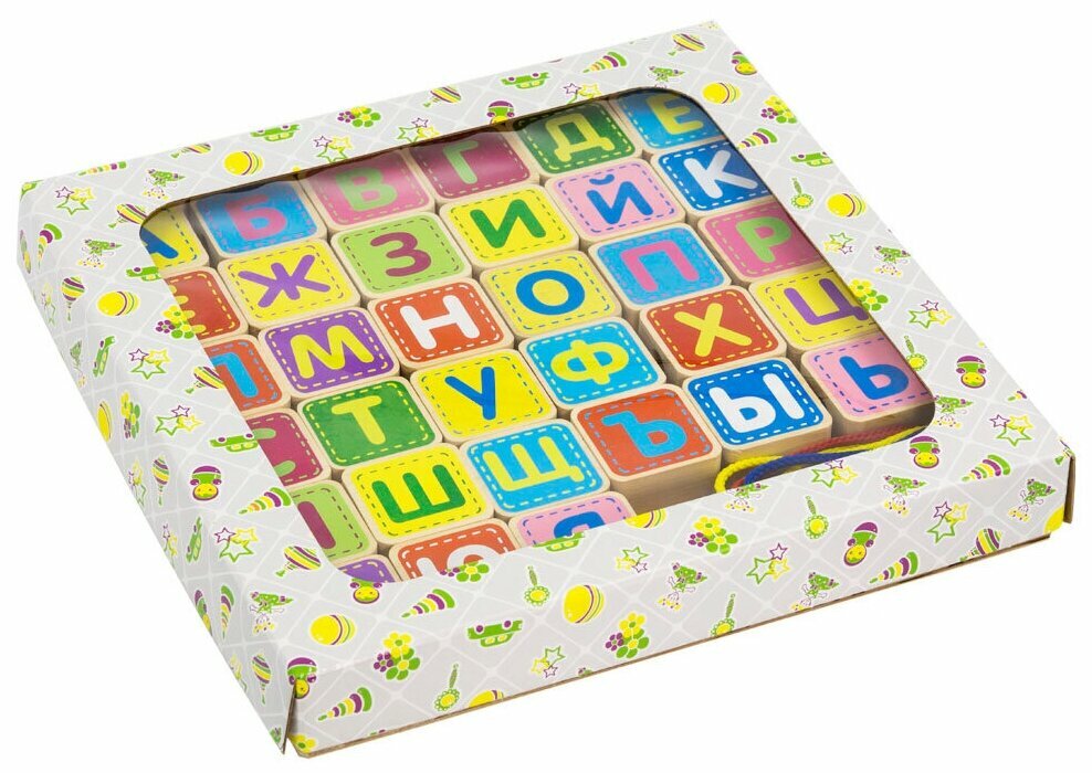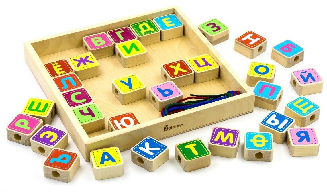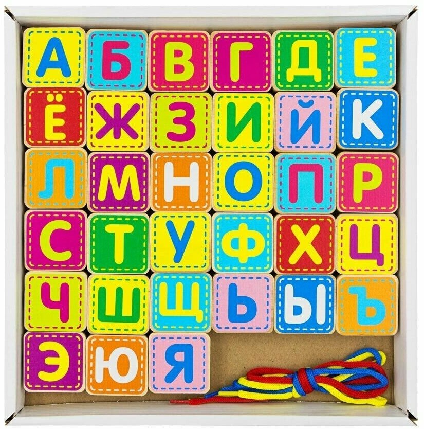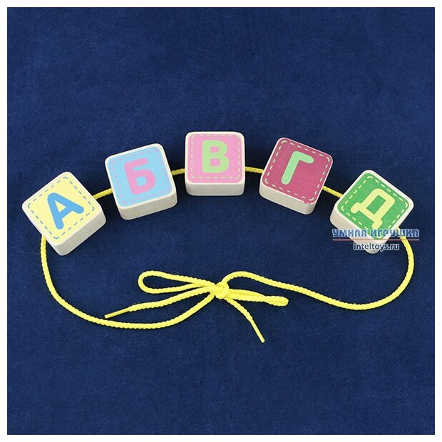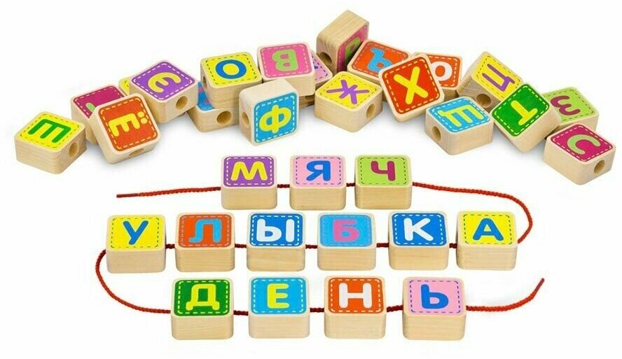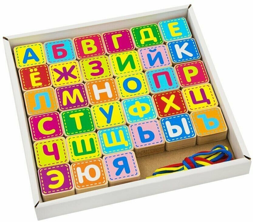| Состав набора | 33 кубика с буквами русского алфавита,4 шнурка |
