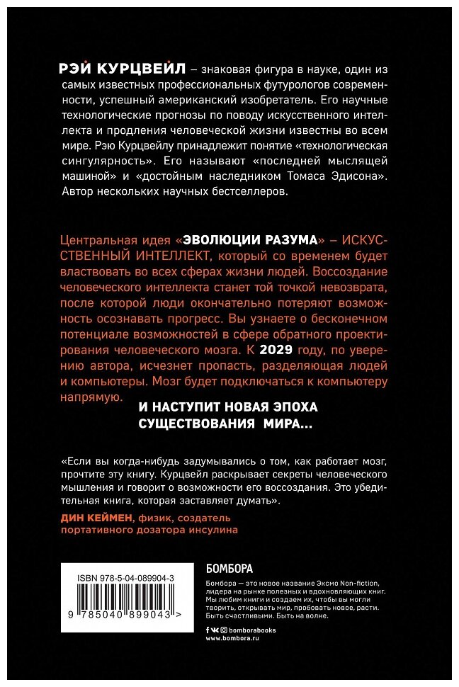 В своей книге "Эволюция разума" известный американский футуролог, технический директор Google раскрывает бесконечный потенциал возможностей в сфере обратного проектирования человеческого мозга. Самый известный прогноз автора: в 2045 году должна произойти технологическая сингулярность, момент, после которого спрогнозировать что-то будет почти практически невозможно, т.к. к тому времени искусственный интеллект станет настолько мощным, что мозг не сможет понять. Технический прогресс человечества выйдет на новый уровень. "Эволюцию разума" невозможно пропустить всем тем, кто интересуется развитием искусственного интеллекта или просто будущим цивилизации.