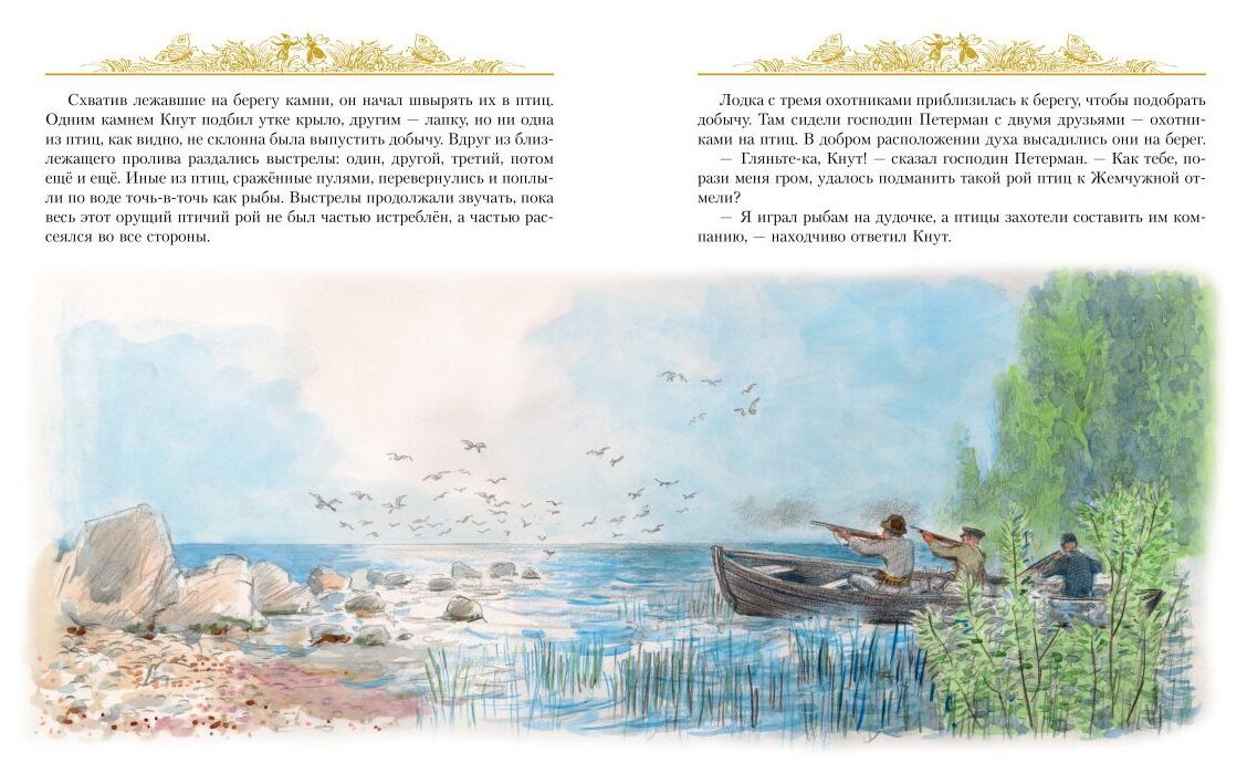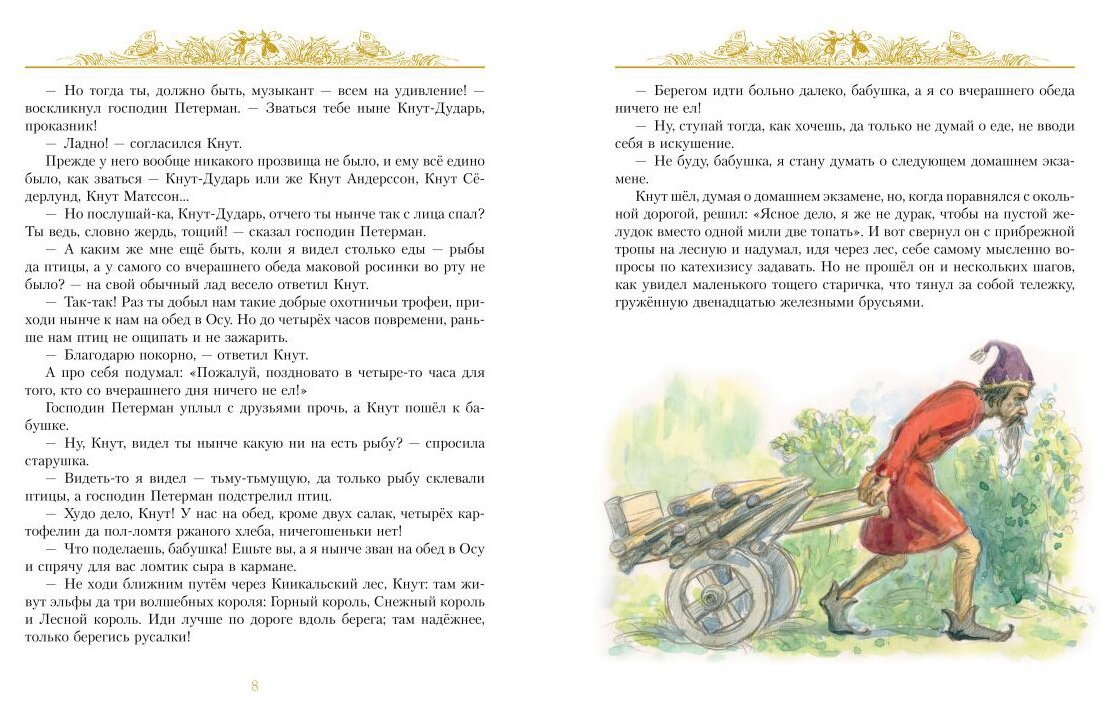 Еще одна замечательная книга с иллюстрациями Алексея Рейпольского, на этот раз со сказками Сакариаса Топелиуса. Книга очень большого формата, поэтому рисунки смотрятся великолепно. Бумага плотная, белая, шрифт крупный. Иллюстрации чудесные, нежные, акварельные, очень утонченные, и их много - восемнадцать на целую страницу, две на весь разворот, и очень много на пол странички по тексту. На форзаце - суровая природа северного края, скалы, море и неприступная крепость, а нахзац более веселый, на нем картина жаркого летнего, но все-таки северного, дня. В книге хорошая подборка сказок, наряду с известными и часто печатающимися есть и редкие, всего их восемь - "Кнут-дударь, проказник", "Зимняя сказка о соснах Достаньтучу и Зацепибородойоблака", "Сампо-лопаренок", "Звездоглазка", "Дар морского короля", "Серебряная чаша Унды Марины", "Великан-тучегон", и "Как портной пришил к Финляндии Швецию". Книга понравилась необычайно.