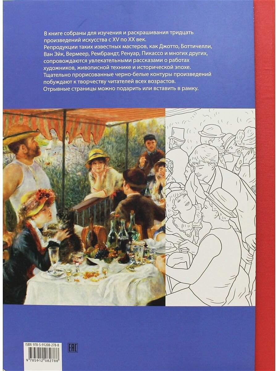 В этой прекрасной книге собраны для разглядывания, изучения и раскрашивания тридцать величайших произведений искусства с XV по XX век. Репродукции таких известных мастеров искусства как Джотто, Боттичелли, Ван Эйк, Вермеер, Рембрандт, Ренуар и многих других, сопровождаются увлекательными рассказами о работах художников, живописной технике и исторической эпохе. Тщательно воспроизведенные в черно-белом рисунке произведения как будто призывают любителей от семи до семидесяти семи лет: раскрась меня!