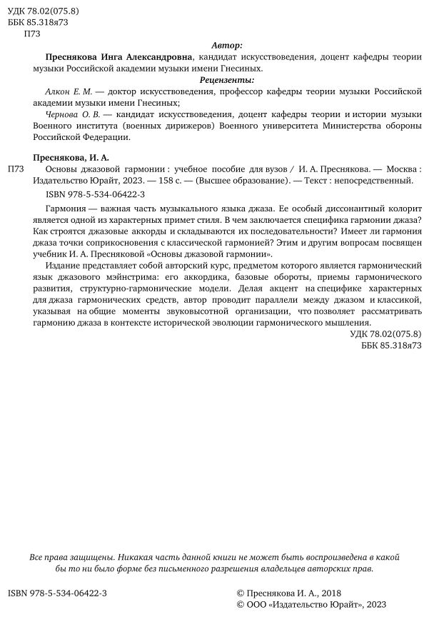 Пособие «Джазовые стандарты в курсе сольфеджио»И.А.Пресняковой уже прочно вошло в число лучших в практике эстрадно-джазового обучения.Думается, «Основы джазовой гармонии» ждет такой же успех.Учебник удобный,понятный, есть и теоретический и практический материал,изложенный в краткой,доступной форме.