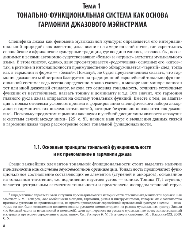 Гармония — важная часть музыкального языка джаза. Ее особый диссонантный колорит является одной из характерных примет стиля. В чем заключается специфика гармонии джаза? Как строятся джазовые аккорды и складываются их последовательности? Имеет ли гармония джаза точки соприкосновения с классической гармонией? Этим и другим вопросам посвящен учебник И. А. Пресняковой «Основы джазовой гармонии». Издание представляет собой авторский курс, предметом которого является гармонический язык джазового мэйнстрима: его аккордика, базовые обороты, приемы гармонического развития, структурно-гармонические модели. Делая акцент на специфике характерных для джаза гармонических средств, автор проводит параллели между джазом и классикой, указывая на общие моменты звуковысотной организации, что позволяет рассматривать гармонию джаза в контексте исторической эволюции гармонического мышления.