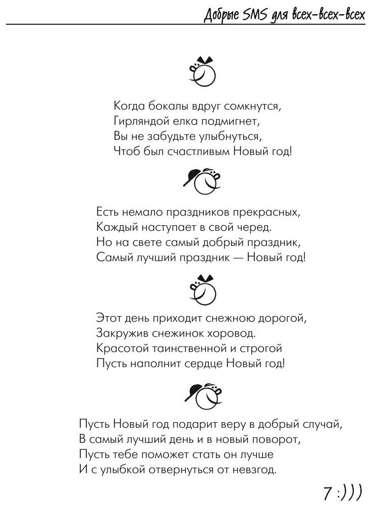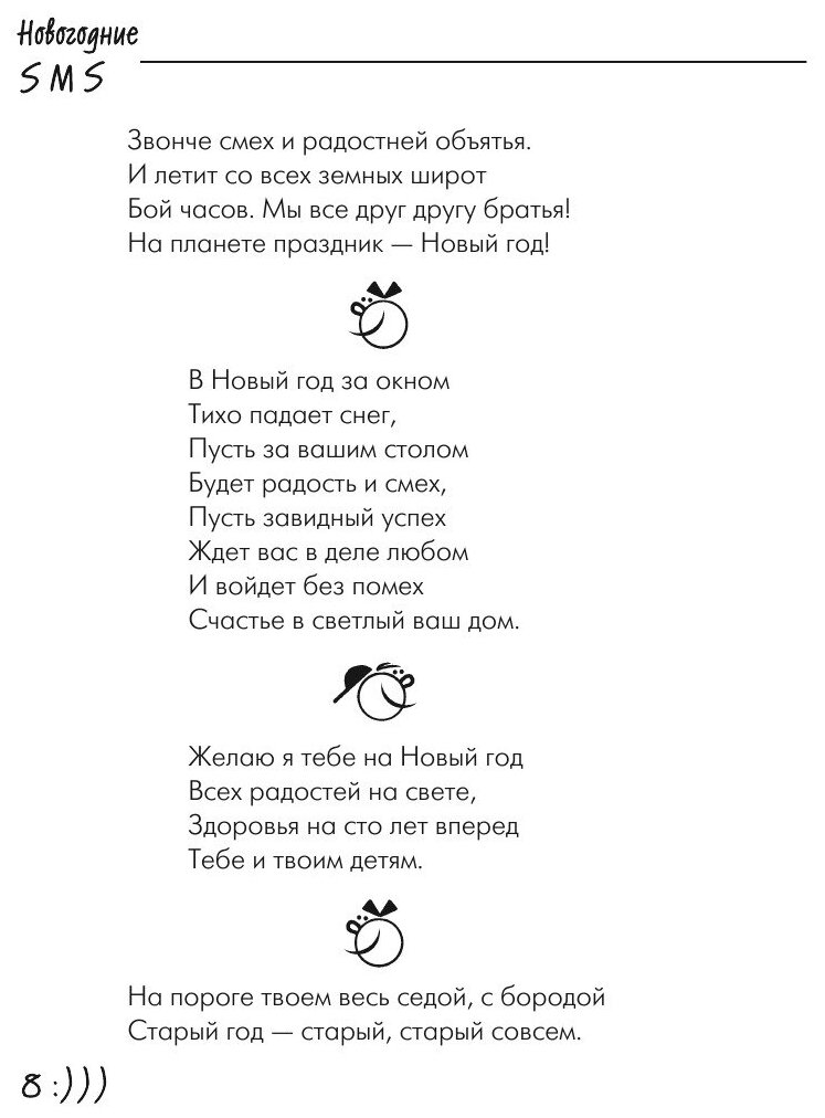 Вы хотите поздравить родных и близких с Новым годом по sms? Выразить им свою симпатию, пожелать счастья и удачи? Или отправить новогодний прикол другу? А вам в голову приходят только стандартные фразы? Тогда эта книга для вас. Ведь на её страницах вы найдете более 700 самых интересных и необычных новогодних поздравлений.