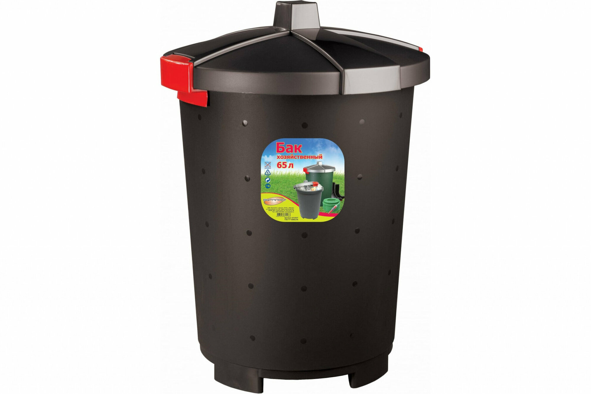 Прочный пластиковый бак объемом 65 литров может использоваться как в помещениях, так и на улице. Благодаря застежкам крышка надежно держится на изделии.
