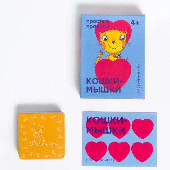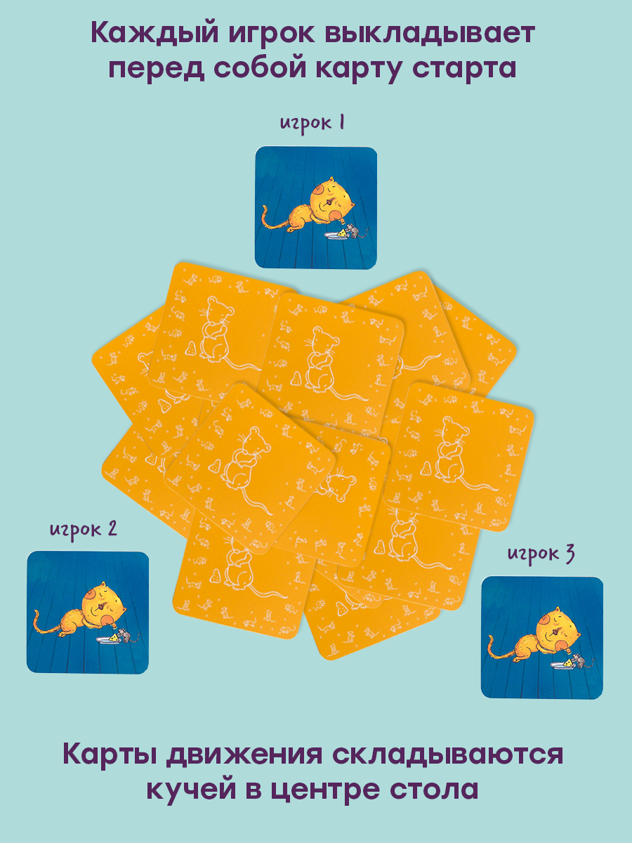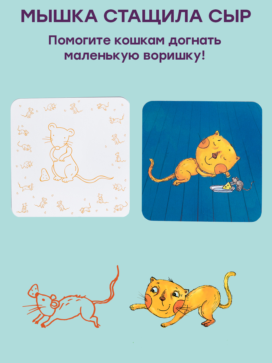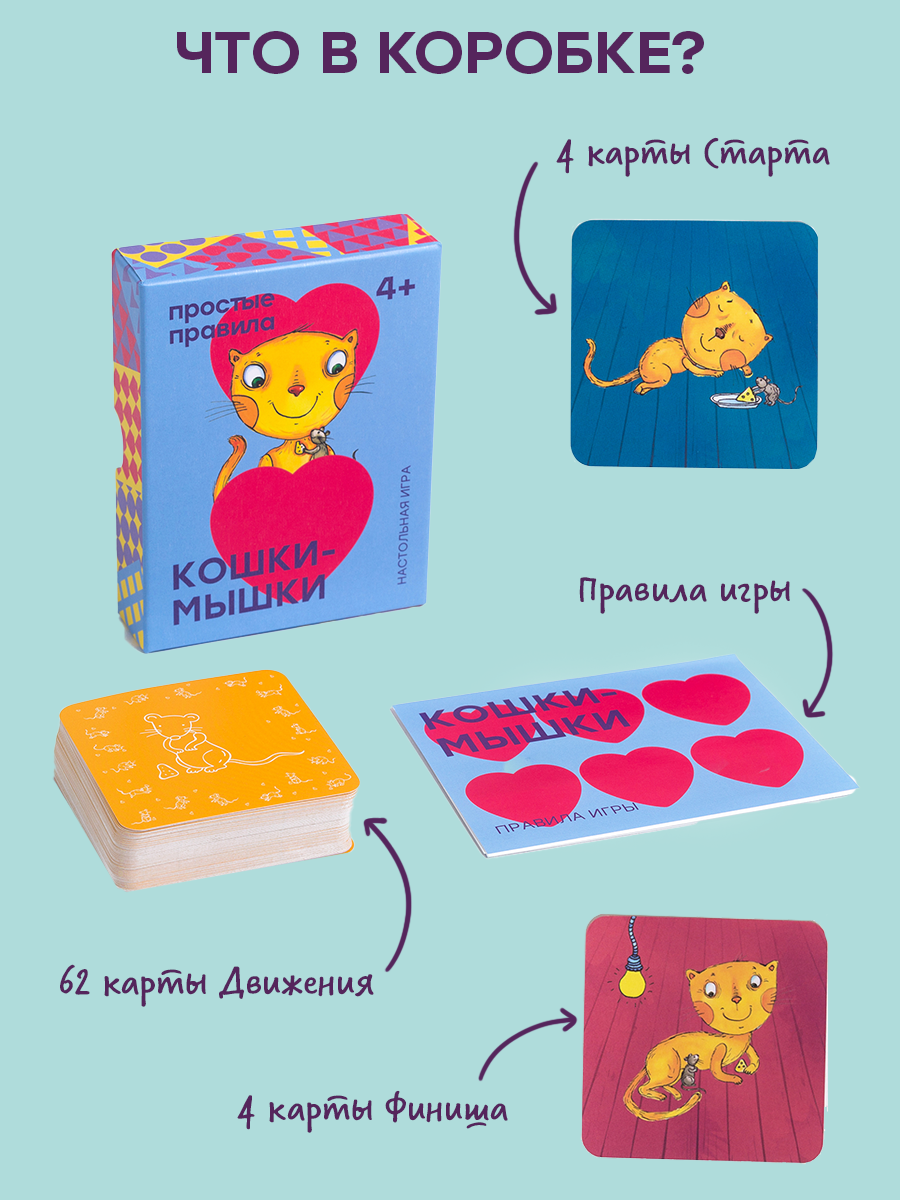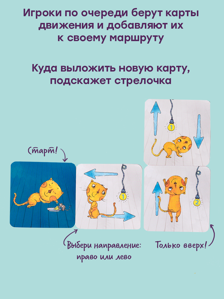 "«Кошки-мышки» — забавная развивающая настольная игра. Поможет детям научиться ориентироваться в пространстве и проверит всех на внимательность и быстроту реакции.В чем суть игры?Мышка стащила сыр! Но кошки не дремлют — они уже пустились в погоню! Чтобы поймать мышку и победно мяукнуть, кошке надо выложить дорожку из карточек от стартовой синей до финишной красной.Чем длиннее получится дорожка, тем больше очков будет у кошки, которая бежит по ней.Как выкладывать?Не соблюдая очередность ходов, берём из колоды карточки с указанными на них направлениями («направо», «налево», «вверх», «вниз») и строим из них дорожку, по которой кошка бежит за мышкой.Дорожка не должна делать петли и пересекать дорожки других игроков. Как только один из игроков вытащит красную карточку — раунд игры закончен. Время проверить правильность пути, если всё верно — собрать карточки в свою победную стопку и… начать новый раунд! Кому интересна эта игра?Тем, у кого в семье есть дошкольники.Тем, кто ищет полезный и интересный подарок ребёнку-детсадовцу или младшему школьнику. «Кошки-мышки» стоит взять с собой в гости на день рождения или детский праздник.В комплекте62 карты движения4 карты «мяу-мяу»4 карты «пи-пи»Правила игры "