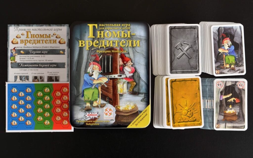 Ещё больше персонажей, возможностей, сокровищ в конкурентной и хитрой игре про гномов, которую обожают во всём мире. В красивой металлической коробке (она прям готова стать подарком) удобно устроилась и базовая версия игры Гномы-вредители, которая многим знакома, и большое классное дополнение. Бархатный органайзер, карты плотные и приятные на ощупь, да ещё и картонные фишки появились! Ладно, потрогаете потом сами, давайте поборемся за золото — разложить теперь можно даже на 12 человек.