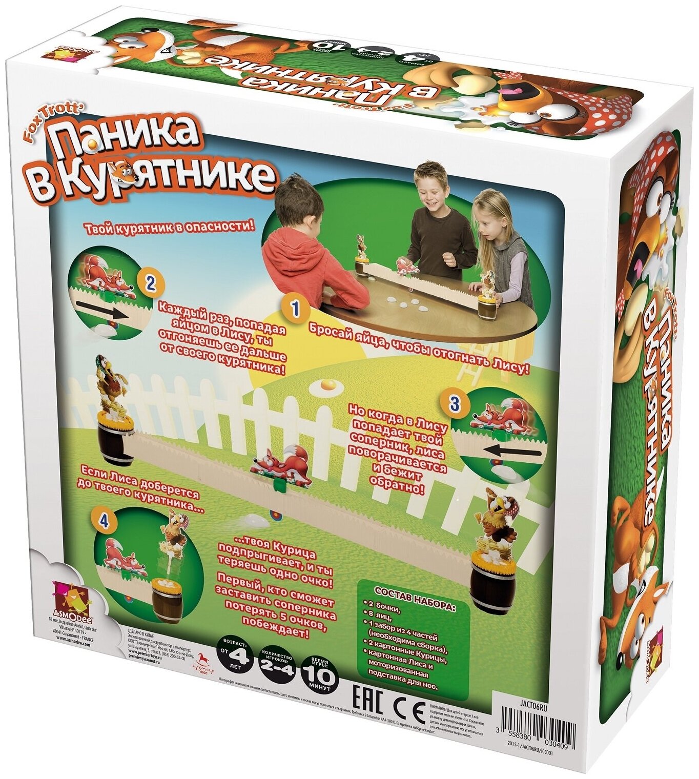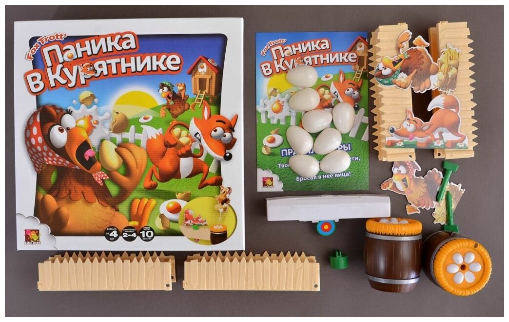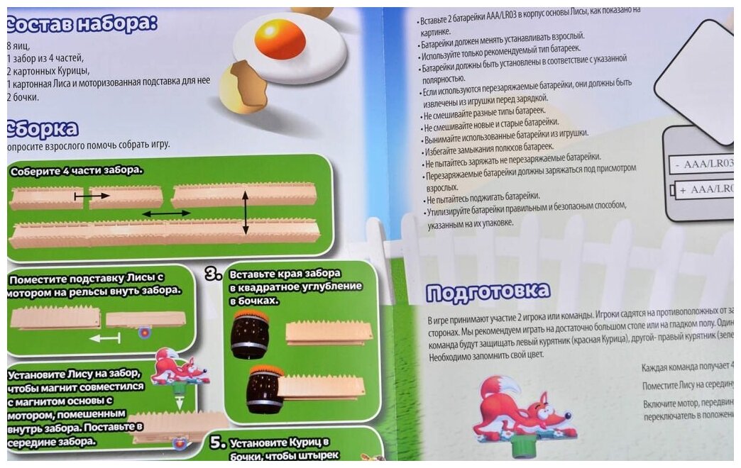 "Время игры: 10 минут. Уморительная игра с лисой, курами и моторчиком. Ваш курятник в опасности. Отгоняйте лису, бросая в нее яйца! Да поторопитесь, соперник попытается вам помешать.В комплекте 8 яиц1 забор из 4 частей2 картонные курицы1 картонная лиса1 моторизированная подставка для лисы2 бочки-подставкиДополнительно потребуются 2 мизинчиковые батарейки ААА (в комплект не входят).Как играть? В игре принимают участие 2 игрока или команды. Игроки садятся на противоположных от забора сторонах. Один игрок или команда защищают курятник с красной курицей. другой — с синей. каждая команда получает 4 яйца. Поместите лису на середину забора. Включите мотор, передвинув переключатель.Цель каждого игрока — попасть с мишень и таким образом отодвинуть лису подальше от своего курятника и одновременно придвинуть ее ближе к курятнику соперника.Когда лиса достигает курятника, курица выпрыгивает, и игрок теряет одно очко. Игра продолжается до 5 очков. "