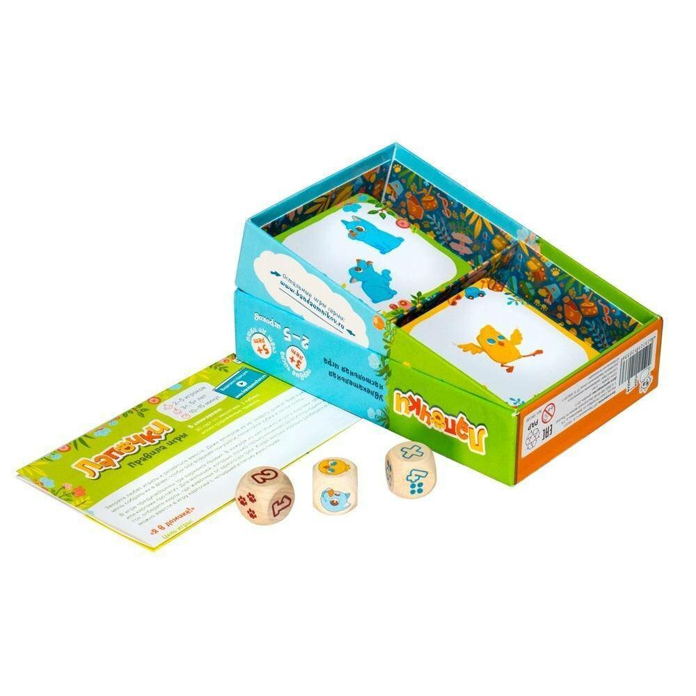 Время игры: 10–15 минут Количество игроков: 2-5 Предмет: математика, счет Зверята любят играть и резвиться вместе. Даже вечером их не зазвать домой! Вам нужно помочь собрать их в доме, чтобы они вовремя покушали, почистили зубки и легли спать. В игре предусмотрены три варианта правил. В каждом из них можно играть картами "до трех" или картами "до пяти". Для малышей, которые только-только начинают различать "один" и "много", отберите карты, где животных от одного до трех. Когда малыш хорошо разберётся с ними, можно ввести в игру карточки с четырьмя и пятью животными. Кубики для игры деревянные. Один кубик со зверятами и два с числами. Для игры по упрощенным правилам "до трех" понадобится кубик с красными числами, а для игры "до пяти" — кубик с голубыми числами. Три кубика: один с животными и два с числами. Плотные игровые карточки заламинированы, что делает их долговечными даже при игре с малышами. Карты из игры рассыпаны общей кучей.В комплекте 30 плотных карт с ламинацией 3 кубика Иллюстрированные правила Посмотреть правила игры Шпаргалка для продавцов — "Лапочки"