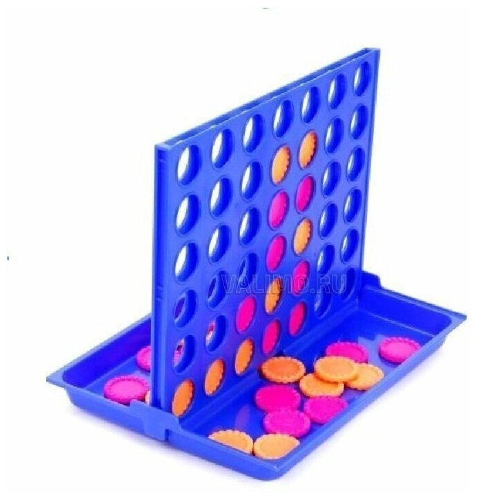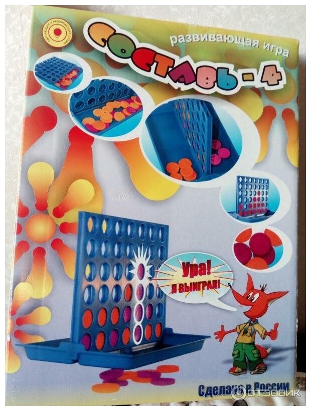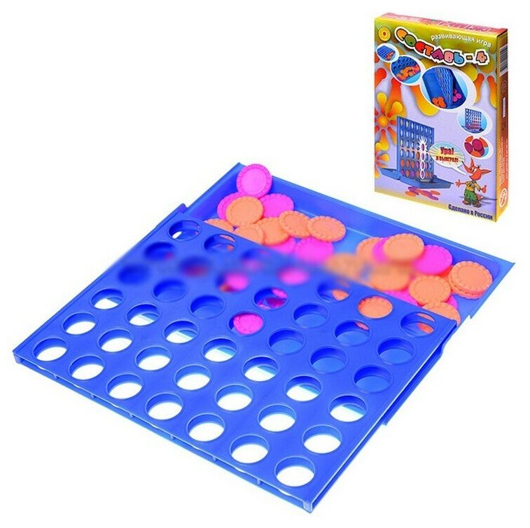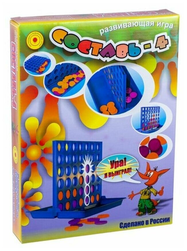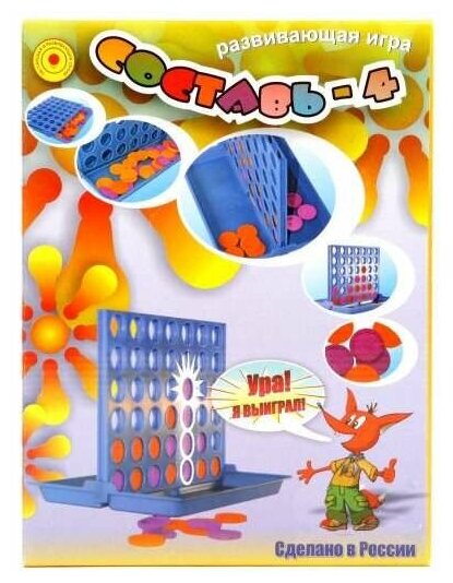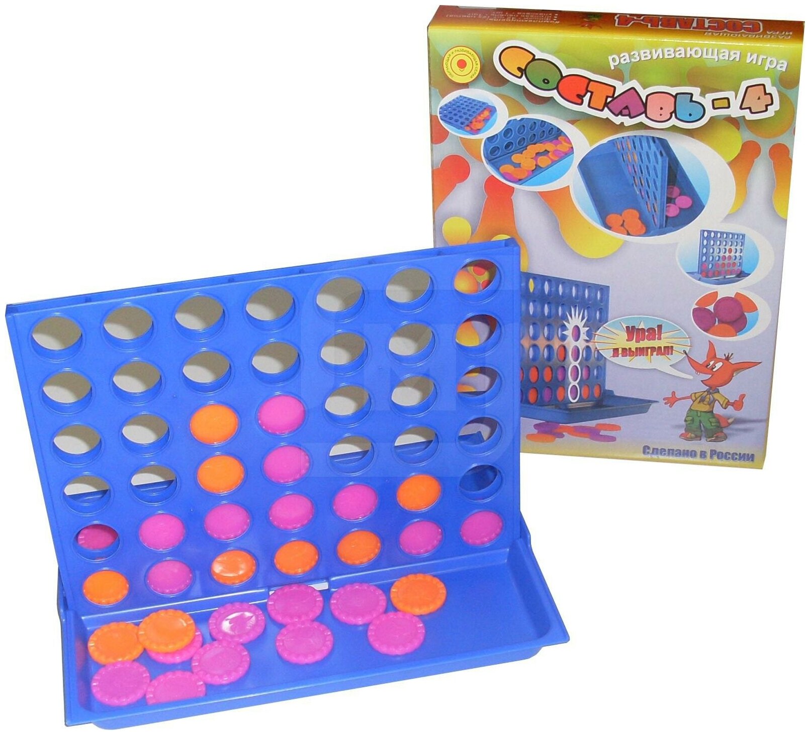 "Настольная игра «Составь 4» — это аналог всем известных «Крестиков-ноликов», но в более привлекательном формате. Больше никаких поисков ручки и бумаги — на специальном поле играть намного интереснее.Задача игрока простая — сложить 4 фишки так, чтобы они стали в ряд. В этом ему будет мешать соперник — он тоже стремится собрать свой ряд, и для победы это нужно сделать первым. Активно соперничая и мешая друг другу, ребята посоревнуются в том, у кого лучше работает смекалка. Трудность в том, чтобы одновременно следить за своими ходами и действиями соперника, предугадывать развитие событий.Игра веселая и полезная — задействует мышление, логику, учит просчитывать ходы наперед. Начинать можно снова и снова, так что настольная игра «Составь 4» не даст детям заскучать. "