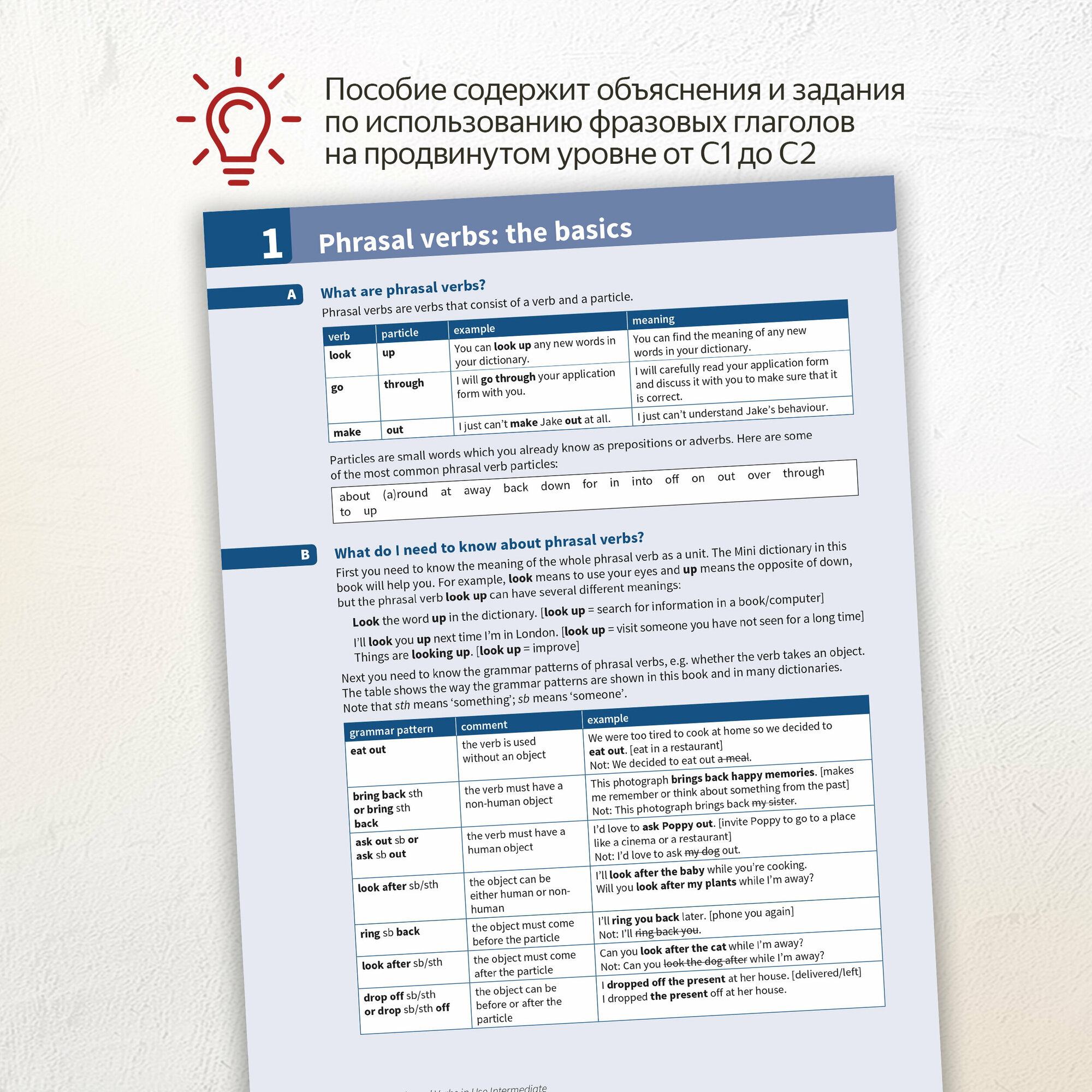 Отличное пособие, как и другие книги из этой серии на левой стороне содержит пояснения, а на правой - упражнения. Качественная печать, иллюстрации, интересные разные упражнения. Автор выбрал действительно используемые и нужные фразовые глаголы для повседневной речи и чтения книг.