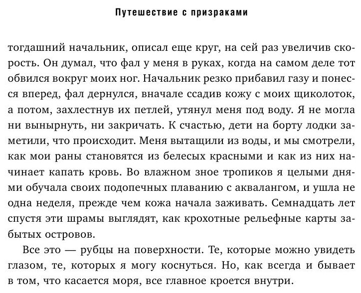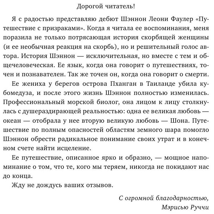 Я люблю такие большие книги, которые займут достойное место в домашней библиотеке. Они должны быть красивы как снаружи, так и внутри. Путешествуя с призраками – из этой серии. Сначала меня заинтриговало название – тут какая-то мистика и загадочность и интересная история. А когда я начала читать, то не могла оторваться. Это красивый роман, который имеет под собой реальную основу. Жених Шэннон действительно погиб от ожога медузы и к этому нельзя никак подготовиться. Автор описывает свой путь от отрицания ситуации до ее принятия. Поначалу я немного боялась, что это будет одно бесконечное нытье – сложно испытывать другие эмоции в этой ситуации, но книга оказалась очень сильной и в художественном плане. Отличный слог и композиция! 5+