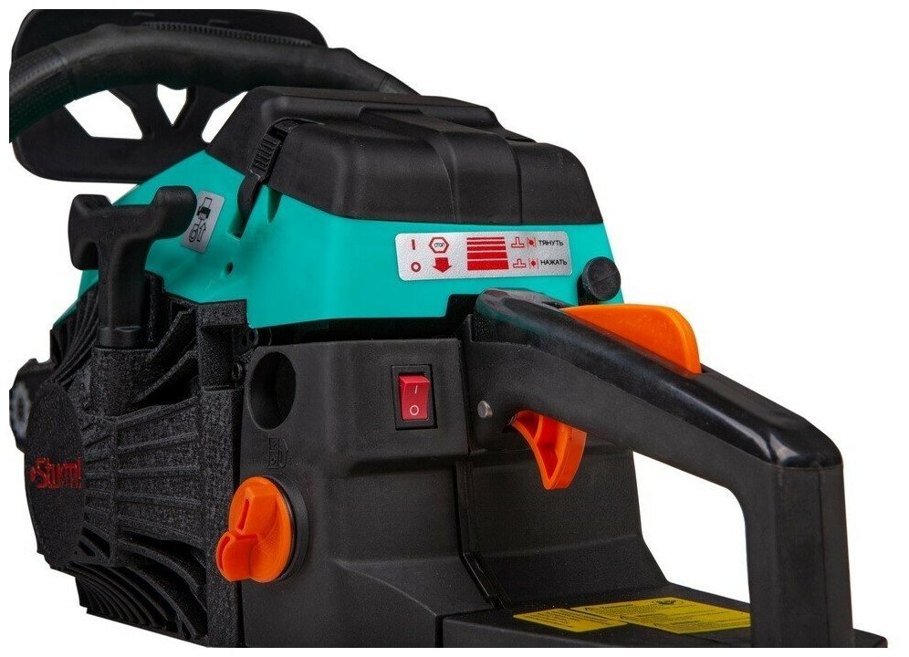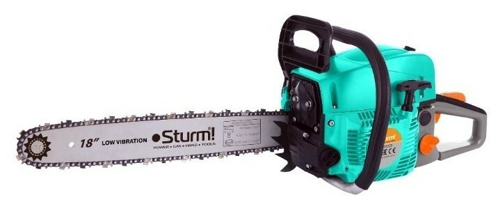 Sturm это компактная, легкая, хорошо сбалансированная бензопила для хозяйственных нужд. Бензопила прошла комплекс мер по подготовке к российским условиям эксплуатации и способна нормально функционировать при температуре до -30С. Модель имеет встроенную антивибрационную систему. Система автоматической подачи масла при работающем двигателе насос подает масло для смазки режущей гарнитуры из специально отведенной емкости. Праймер для подкачки топлива облегчает холодный запуск мотора. Мощность 4 л.с.