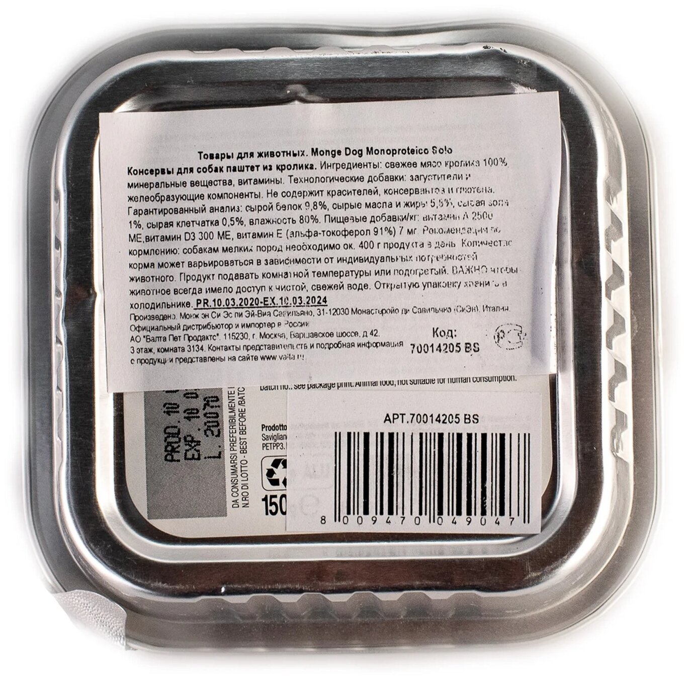 Гарантированный анализ: сырой белок 9,8%, сырые масла и жиры 5,8%, сырая зола 1%, сырая клетчатка 0,5%, влажность 80%. Пищевые добавки/кг: витамин А 2500 МЕ, витамин D3 300 МЕ, витамин Е (альфа-токоферол 91%) 7 мг.Ингредиенты: свежее мясо кролика 100%, минеральные вещества, витамины. Технологические добавки: загустители и желеобразующие компоненты. Не содержит красителей, консервантов иглютена.Рекомендации по кормлению: собакам мелких пород необходимо ок. 400г продукта в день. Количество корма может варьироваться в зависимости от индивидуальных потребностей животного. Продукт подавать комнатной температуры или подогретый. ВАЖНО, чтобы животное всегда имело доступ к чистой, свежей воде. Открытую упаковку хранить в холодильнике.