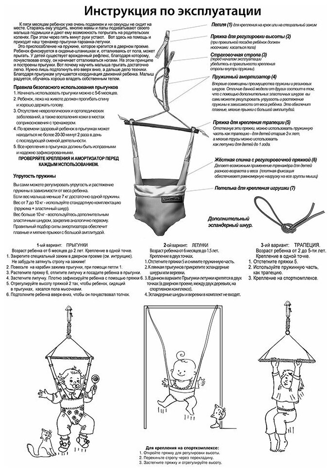 Прыгунки Спортбэби VIP с зацепом Прыгунки с зацепом от фирмы Спортбэби - это модель прыгунков улучшенного дизайна! Прыгунки-тарзанка-качели обязательно понравятся вашему малышу! Можно начинать их использовать уже с 4 месяцев. Это приспособление на пружине, которое крепится в дверном проеме. Благодаря прыгункам улучшается координация движений ребенка. Малыш радуется, обучаясь хорошо владеть собственным телом. Дополнительно: Возраст: от 4 месяцев. Материал: текстиль, синтепон. Упаковка: пластиковая сумка.