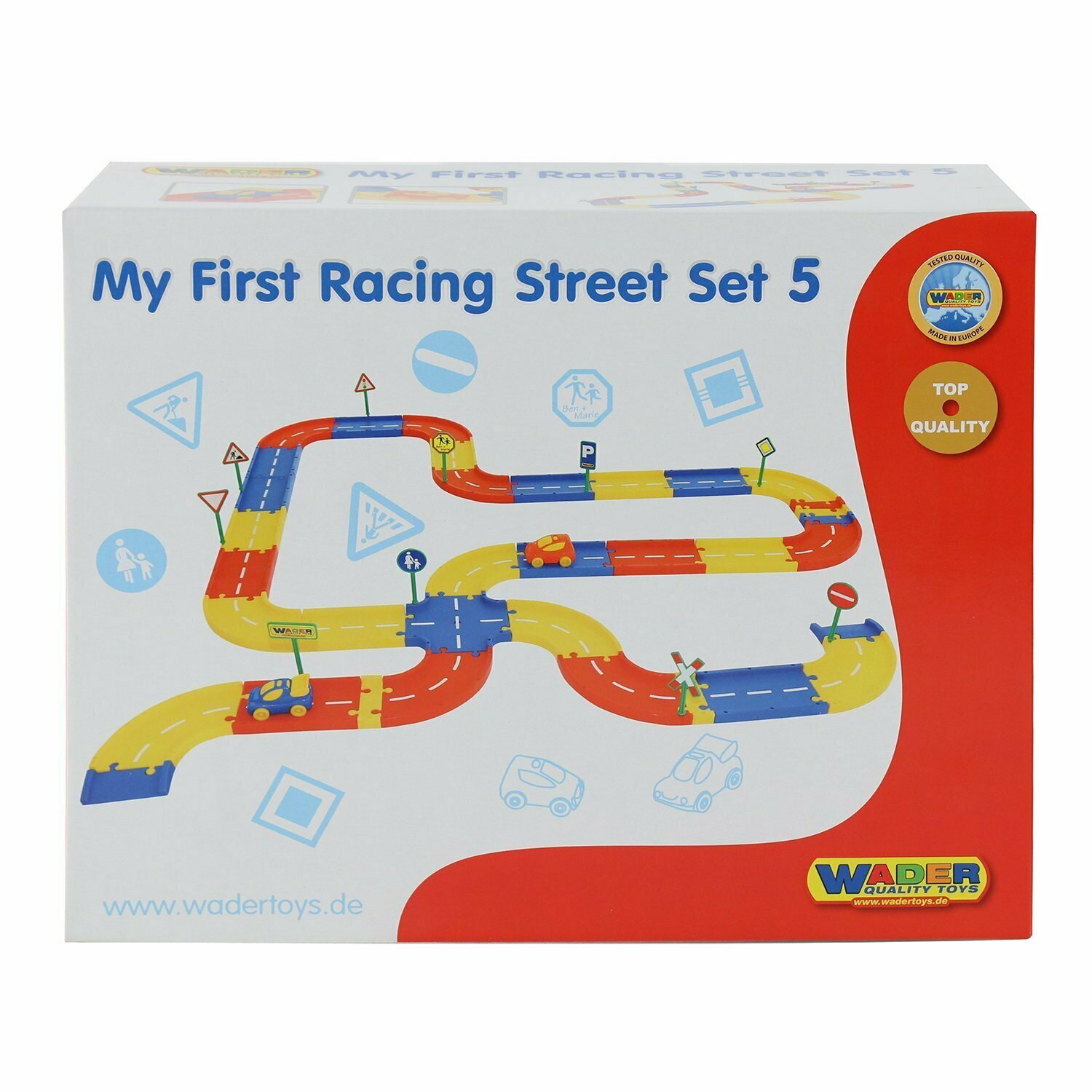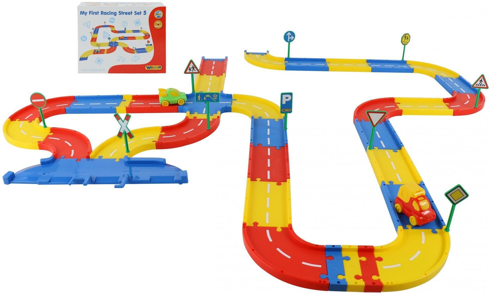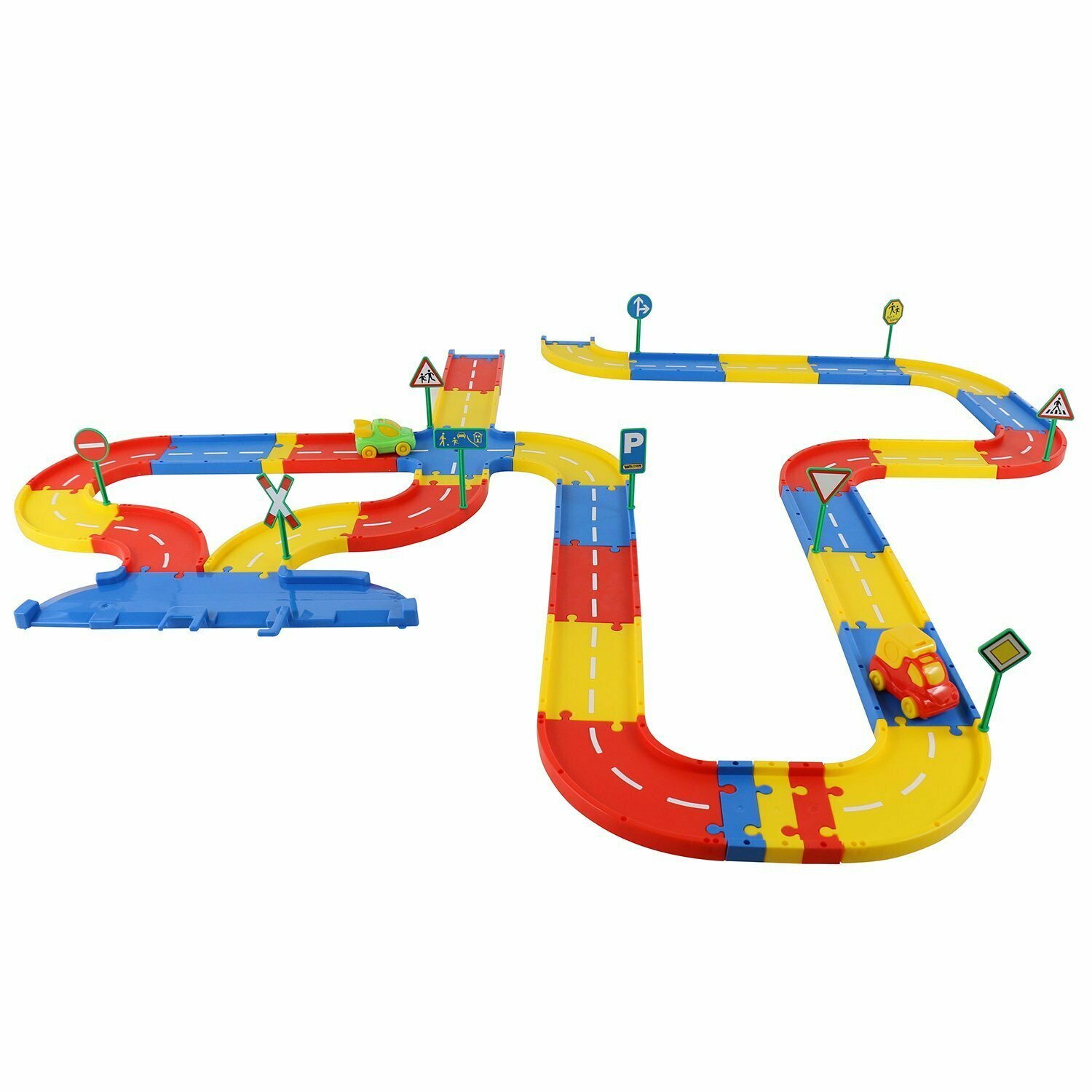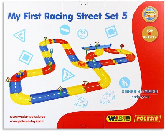 Размеры упаковки: 58,5 х 39 х 8,3 см В наборе 48 элементов, в том числе 10 дорожных знаков и 2 автомобиля. В качестве автомобилей для гонок вы сможете использовать набор «Мини» от этого же производителя. Эти маленькие машинки идеально подходят для дорожек трека. Прочные пластмассовые детали гоночного трека № 5 подходят по размеру и могут быть соединены с деталями других треков и паркингов для увеличения игровых возможностей трека.